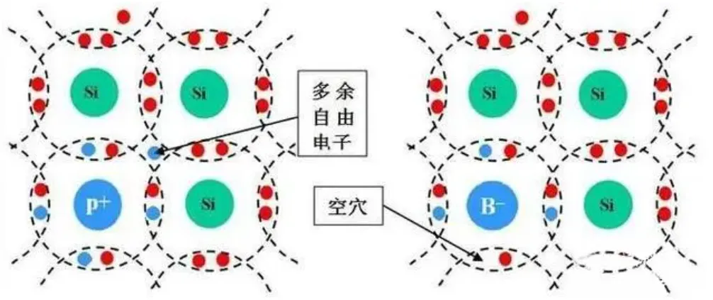 在硅晶体中掺入磷元素,即可做成N型硅片。磷为5价元素,与纯硅结合后,磷原子5个外层电子中的4个与周围的半导体原子形成共价键,剩下的1个电子几乎不受束缚成为自由电子,表现出负电特性,即N型硅(Negative,带负电)。图:N型硅片和P型硅片区别