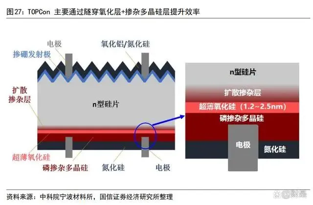 首先,以P型硅片为主体材料,在其基础上扩散磷元素,形成n+/p型结构的电池,即为P型电池片,代表结构为PERC,Passivated Emitter and Rear Cell,即“钝化发射极和背面电池技术”。其次,以N型硅片为主体材料,在其基础上扩散硼元素,形成p+/n 型结构的电池,即为N型电池片,代表结构为TOPCon,TunnelOxide Passivated Contact,也就是“隧穿氧化层钝化接触技术”。