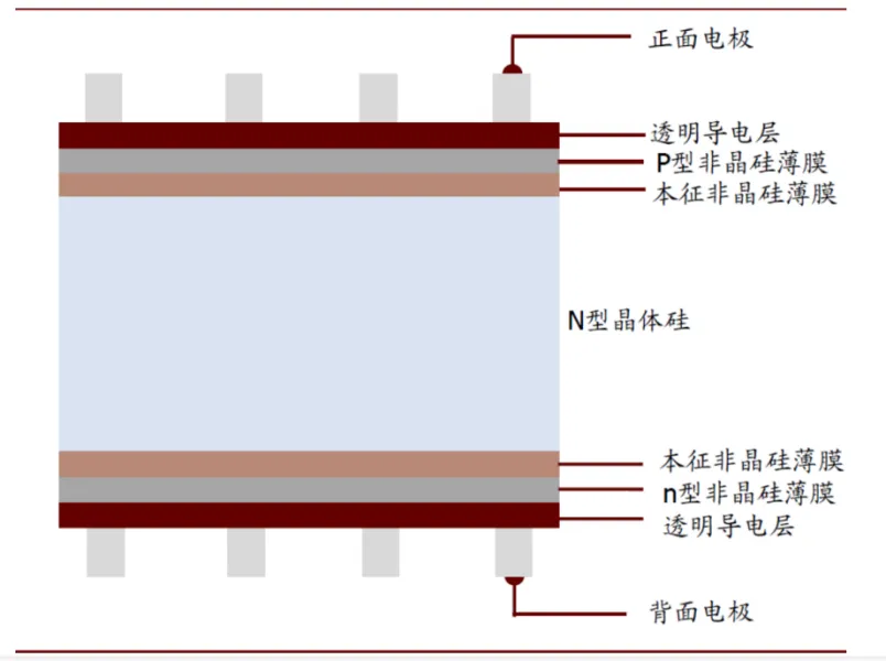 表面钝化技术,就是为了解决少子复合问题而生,它可以降低表面复合速率,其主要方式就是饱和半导体表面处的悬挂键,降低表面活性,增加表面的清洁程序,避免由于表面层引入杂质,从而降低少子复合。无论是PERC、TOPCon,还是HJT技术,其技术发展的核心,都是为了实现更好的表面钝化,延长少子寿命,提高转化效率。HJT(本征薄膜异质结)电池,为对称双面电池结构,中间为N型晶体硅,然后在正面依次沉积本征非晶硅薄膜和P型非晶硅薄膜,形成P-N结。其硅片背面,也依次沉积本征非晶硅薄膜和N型非晶硅薄膜,形成背表面场。晶硅,其结晶形态与石英、石墨等物质类似,其结构的结晶度高,因此具有较高的导电性和光电转换效率。不过,其缺点在于体积较大。非晶硅,是指没有明显晶体结构的硅材料,也被称为a-Si,是一种结构无序的非晶体材料。非晶硅的制造成本低、柔韧性强、颜色透明,所以非晶硅太阳能电池的体积相对较小,可以做成薄膜,但其光电转换效率较低。HJT异质结电池让人击节赞叹之处,就是在于创造性的融合了晶硅、非晶硅两种材料的优点。由于非晶硅的导电性比较差,因此HJT需要在电池两侧沉积透明导电薄膜(TCO)来进行导电,之后再采用丝网印刷技术形成双面电极。据中金公司的总结,HJT技术的核心在于,其在P-N结之间插入了本征非晶硅层作为缓冲层,而本征非晶硅层对晶体硅表面有很好的钝化作用,可以大幅避免载流子的复合,实现较高的少子寿命和开路电压。[1]因而,HJT技术很好地解决了常规电池掺杂层和衬底接触区域的高度载流子复合损失问题。