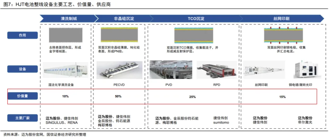 得益于HJT的N型硅衬底,以及非晶硅对基底表面缺陷的双重钝化作用,其量产效率已经逐步提升到24%以上,而且未来还可叠加IBC、钙钛矿技术路线,进而将转换效率提升至30%甚至更高。因而,只要碳中和还要继续、光伏行业还要发展,HJT就会成为绕不过去的核心技术方向。原理和结构解决了,我们来看制作过程:HJT电池的工艺环节分4步,分别为制绒清洗、非晶硅薄膜沉积、透明导电薄膜沉积、丝网印刷,四大步骤分别对应几大设备:清洗设备(价值量10%)、PECVD(价值量50%)、PVD和RPD(价值量25%)、丝网印刷设备(价值量15%)。