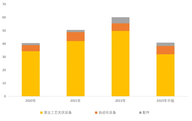 其中,PECVD等离子增强化学气相沉积、RPD反应等离子体沉积、PVD物理化学气相沉积,是核心三大设备。相比PERC电池通常的9~10步,HJT的生产步骤大大减少,具有量产优势。如果用一个词总结未来HJT技术创新方向,那就是“三增一减”。1、减银:银包铜解决方案;2、减栅:0BB工艺解决方案;3、减硅:硅片薄片化;4、一增:UV转光胶膜增效延寿命。除此之外,“低铟”、“电镀铜”等技术均为重要的HJT提效降本方案。从收入规模看,2023年中报,捷佳伟创(40.8亿元)>迈为股份(28.68亿元)>金辰股份(11.44亿元)。捷佳伟创——主营业务为太阳能电池生产设备制造,产品包括PECVD设备、扩散炉、制绒设备、刻蚀设备、清洗设备、自动化配套设备等,自动化设备主要指自动化装卸片机、自动化上下片机等辅助设备,具备PERC、TOPCon、HJT的整线设备供应能力。2023年中报,湿法工艺光伏设备占比78.2%;自动化设备收入占比15.47%。