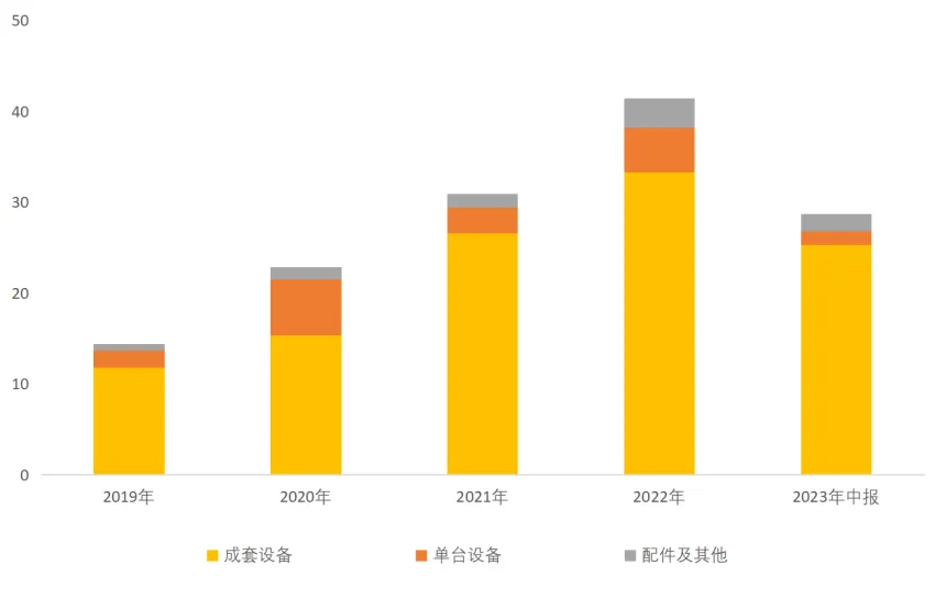 迈为股份——主业为太阳能电池生产设备制造,产品包括真空镀膜设备、丝网印刷机等主设备以及自动上片机、红外线干燥炉等生产线配套设备,具备HJT的整线设备供应能力。2023年中报,成套生产设备收入25.32亿元,占比88.28%;单机设备(非成套设备)收入1.51亿元,占比5.25%;配件等收入1.86亿元,占比6.50%。
