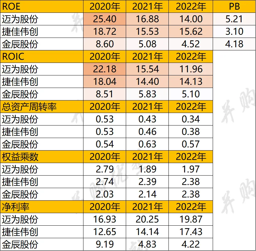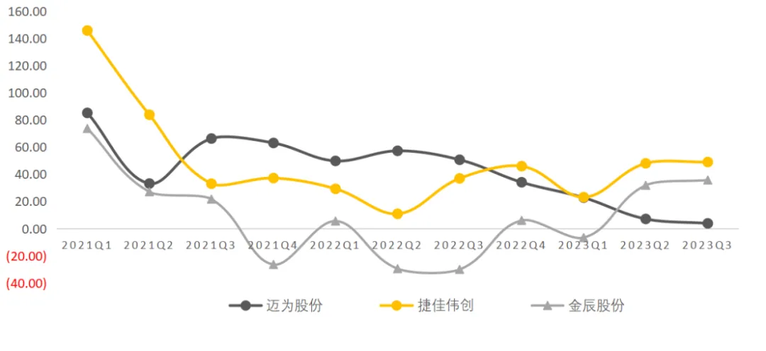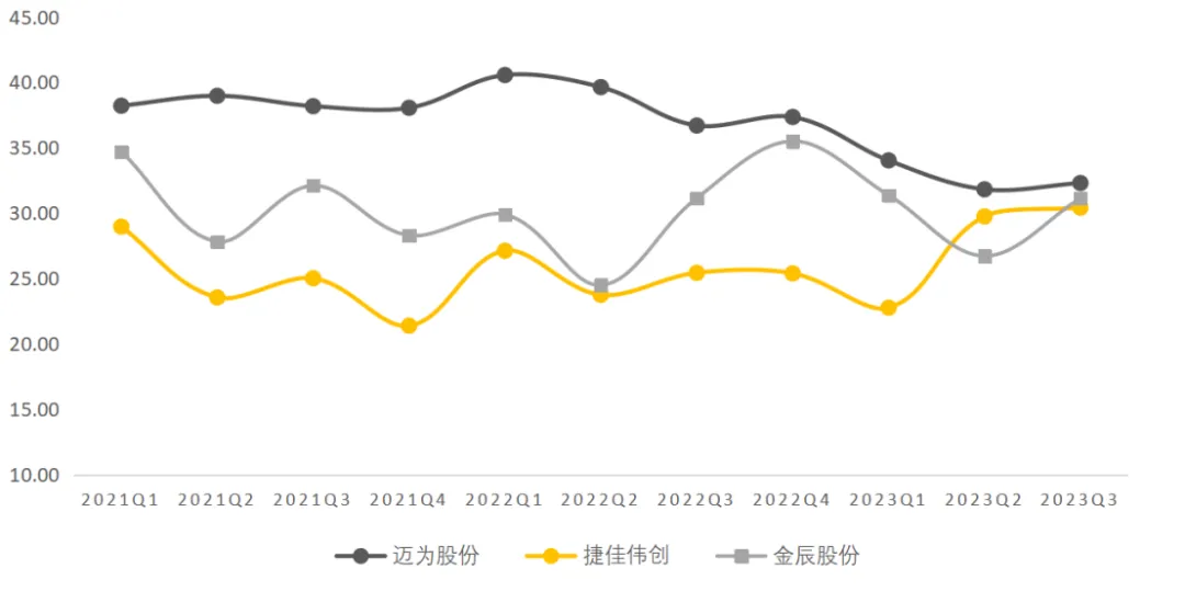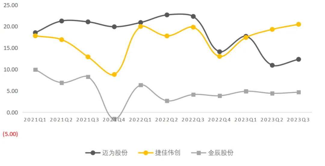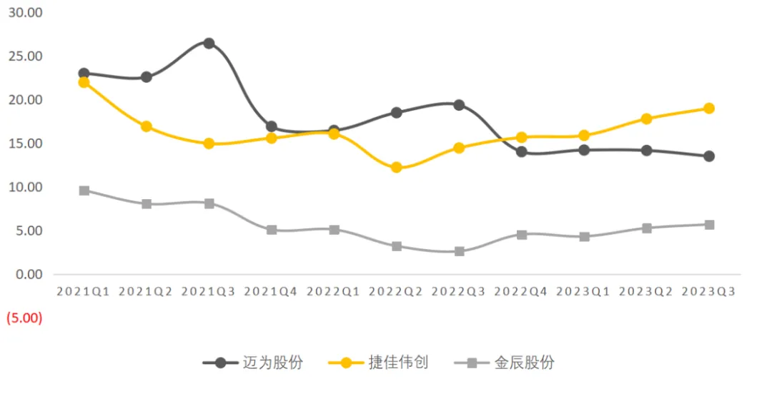 从ROE走势来看,捷佳伟创>迈为>金辰。2023年迈为股份利润率有所下降,主要是异质结整线设备前期存在产线改造的情况,验收进度较慢,并且制造尚未产生规模效应,毛利率较低。捷佳伟创利润率提升,主要受益于TOPCON设备放量,毛利率提升。