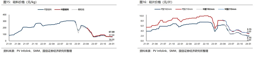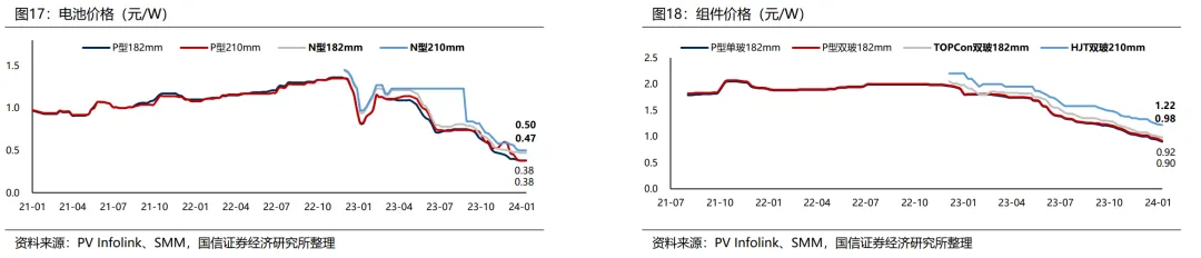 来源:wind、并购优塾从产业链增长表现看,目前中游设备厂商成长性和盈利性表现较好。这与下游仍然处于资本支出周期有关,随着产业链供给过剩,下游扩产速度可能放缓,进而影响设备厂商的订单。从生意质地上来看,设备企业盈利能力较强,资本开支不高,美中不足在于营运资金占用较多。从增长角度看,光伏行业长期成长确定性强,但短期内卷严重,这种情况下,成熟技术需要警惕内卷风险,短期看还是新技术逻辑更好一些。产业链整体目前均处于下行通道中,各环节价格均在低位。硅片及电池片由于P/N产线大规模转换带来短期P型供需失衡,P型库存明显减少,报价出现反弹上行。1月光伏行业进入淡季,产业链排产如期走弱,预计硅料/硅片/电池片/组件产出75/58/56/49GW,环比+6.3%/-8.7%/-9.9%/-12.0%。2月天数较少、叠加春节假期,预计国内/全球排产进一步下降至35-37/41-43GW。