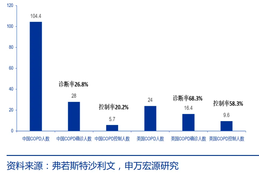 第一,中国有庞大的烟民人群(3.5亿),而吸烟在COPD(慢性租塞性肺疾患)的病因中排名首位。而中国COPD患者的诊断率、控制率,都远低于美国。