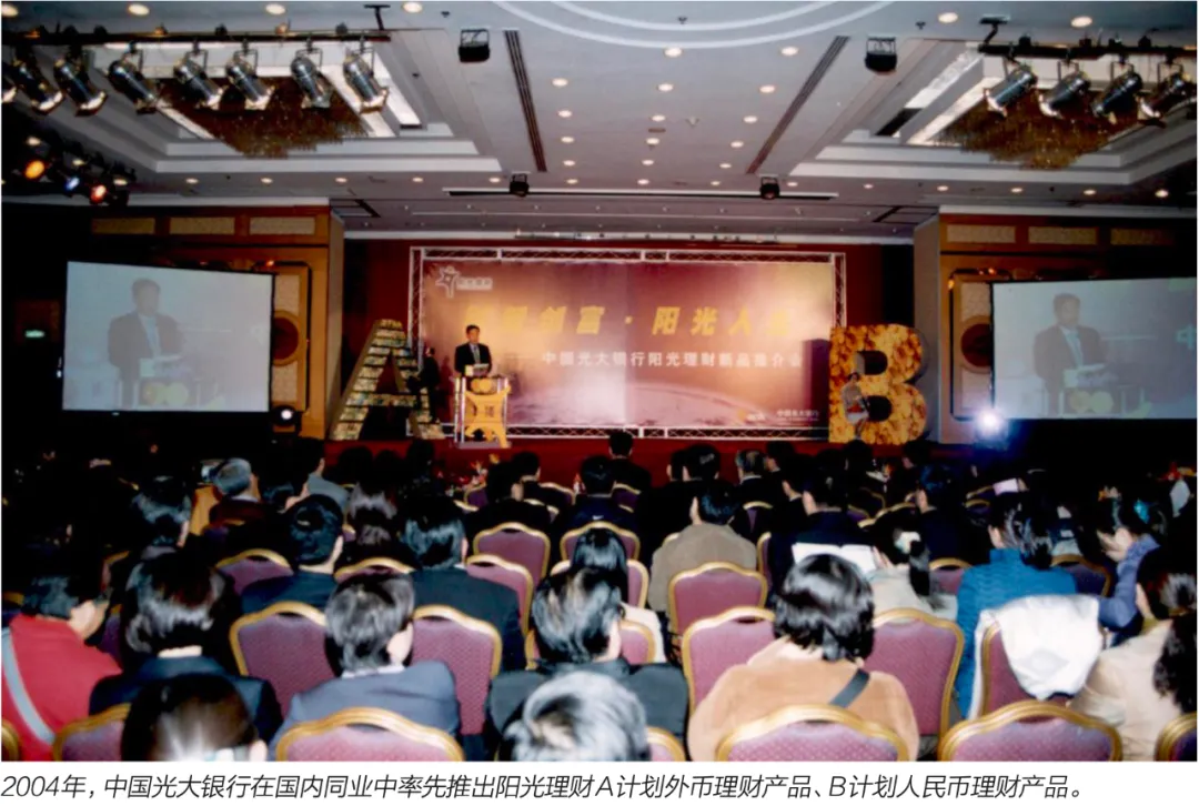 2004年2月,光大银行发行了国内首只个人外币理财产品“阳光理财A计划”;7月,国内第一只人民币理财产品“阳光理财B计划”也获发行。