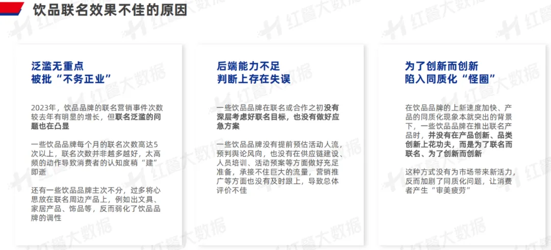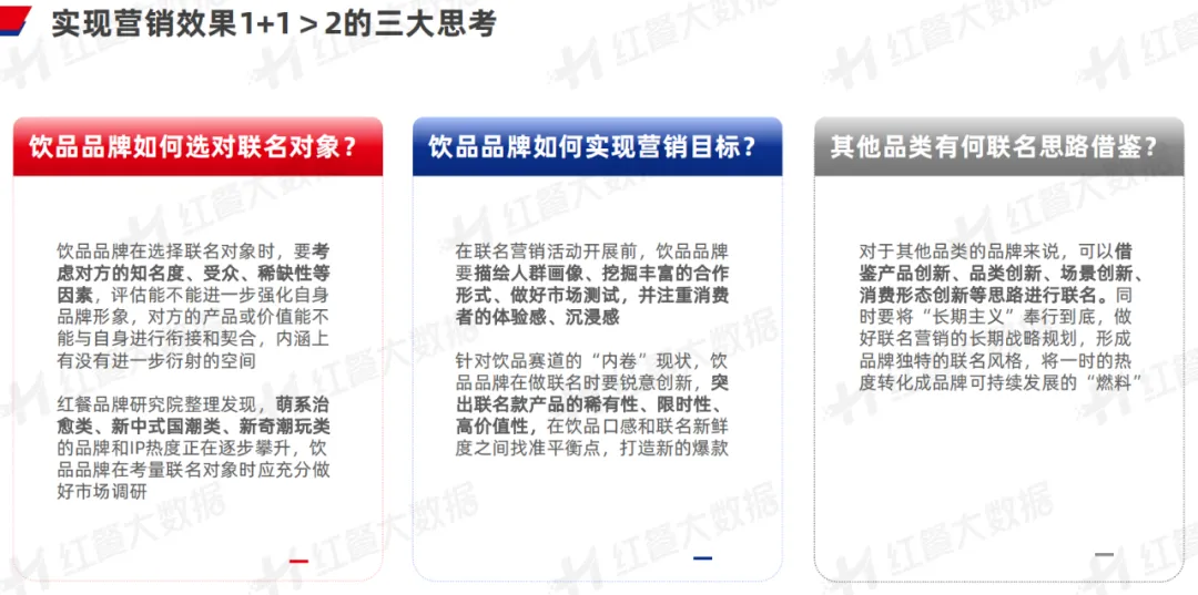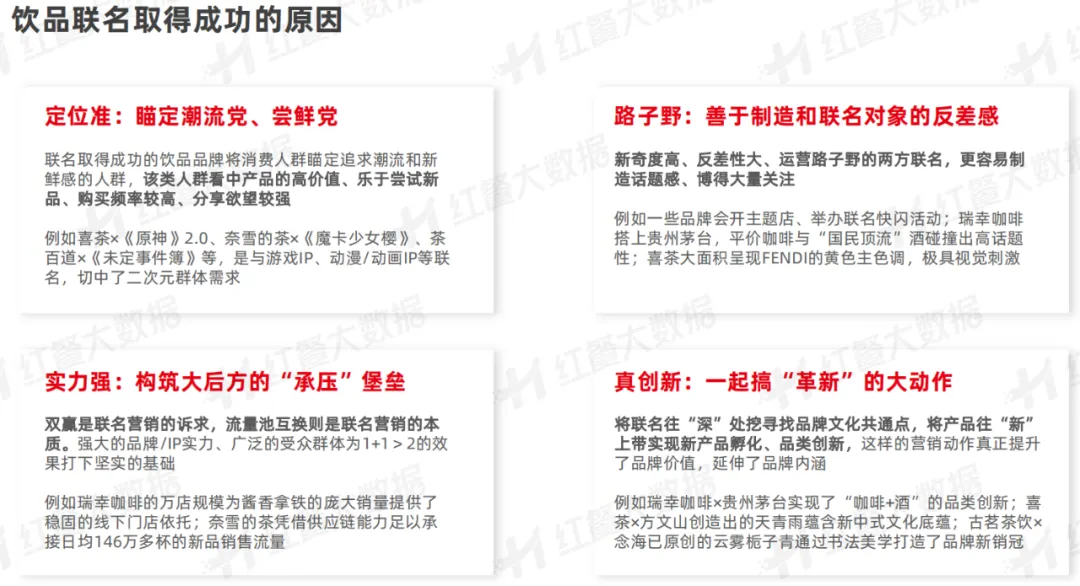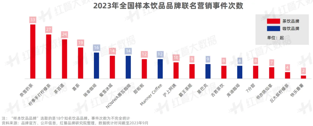 随着饮品赛道内卷加剧,联名营销成为了饮品品牌寻求新突破的一大“利器”。本文转载自红餐智库 (ID:hongcanzk),作者:陈声华。“此去一帆风顺,天官赐福,百无禁忌!”近日,某茶饮店员充满国漫感的喊口号视频在抖音上一举走红,收获了超50万(截至10月底)的点赞量。原来,这是古茗茶饮与动画《天官赐福》“梦幻联动”的其中一个环节。据了解,双方在10月份联名推出了限定套餐,还举办了系列活动为消费者带来沉浸式购买体验,在消费市场引起了热烈反响。事实上,除了古茗茶饮之外,其他饮品品牌亦在积极尝试联名营销。例如今年瑞幸和贵州茅台推出的“酱香拿铁”,喜茶和奢侈品品牌FENDI联合推出的“FENDI喜悦黄”,奈雪的茶和薄盒APP推出的“范特西奶茶”等。在强强联合下,这些联名“显眼包”不仅赚足了眼球,还取得了亮眼的销售业绩。如今,饮品品牌越来越注重联名营销,不仅推出了花式新品,还探索出了更多玩法。而在联名营销热潮的背后,则是饮品赛道越来越卷的现状。在存量市场里,饮品品牌为了赢得更多的市场份额,从卷产品卷供应链卷向了“营销战”,而联名营销的激烈内卷则是营销战的一个“缩影”。那么,2023年,饮品品牌联名营销的整体发展情况如何?爆火的联名产品背后又有哪些成功秘籍?近日,红餐品牌研究院发布了《饮品品牌联名营销观察报告2023》,带您一探究竟。随着消费者对现制饮品需求的提升,饮品市场规模持续上涨。据红餐大数据,2023年饮品市场规模有望达到2613亿元,同比增长22.8%。处于“卷王”林立的饮品赛道,饮品品牌在拼规模、拼供应链、拼IPO、拼加盟的同时,还在联名营销方面暗自角逐。饮品联名营销,指的是饮品品牌与其他品牌/IP合作,联合发布融合性产品(联名款实物产品或虚拟产品)的一种市场营销行为。红餐品牌研究院在本次报告中选取了18个知名饮品品牌作为样本。经统计发现,2023年前三季度,18个样本饮品品牌的联名营销事件总次数达到了236次。与2022年全年相比,2023年前三季度不少饮品品牌联名次数有大幅度增长,例如茶百道、奈雪的茶、古茗茶饮的联名次数涨幅分别达到了118.2%、106.3%、100.0%。其中,奈雪的茶堪称“联名狂魔”,2023年前三季度的联名事件总数高达33次,居于18个品牌之首,其每个月联名次数约在3~5次。细数这些联名营销事件可以发现,饮品品牌的联名营销方式主要有两种:品牌×品牌、品牌×IP。饮品品牌联名营销的受众主要集中在18~30岁的年轻群体,他们乐于尝试新品、社交欲望高,购买力和传播力都较强,并且对于热门的影视、动漫、游戏等潮流较为关注。因此,在和IP联名时,饮品品牌大多会切中目标人群的爱好,联名对象类型多为动漫/动画IP、人物IP、影视综IP、游戏IP,占比分别达到了31.6%、19.3%、10.5%、10.5%。例如动漫/动画IP类的有喜茶联名的动画电影《天空之城》、奈雪的茶联名的动漫《魔卡少女樱》、瑞幸咖啡联名的动画表情包《线条小狗》等;人物IP类的则有喜茶联名的作词人方文山、古茗茶饮联名的非遗传承人樊生华、茶百道联名的电竞选手TheShy等;影视综IP类的有书亦烧仙草联名的电影《封神》、快乐番薯联名的电视剧《安乐传》等。除此之外,游戏IP类也是饮品品牌联名的热门对象,喜茶×《原神》2.0、茶百道×《未定事件簿》均是其中的代表性联名营销事件。虽然饮品品牌在2023年前三季度联名动作频频,但是效果却各有优劣。一些业内人士认为,虽然有一些出圈的饮品火爆市场,但是很多产品“其实并不是真正的创新”。由此看来,现在的饮品联名营销,纵然有出彩的成功案例,依然存在一些效果不佳的案例。那么,成功的饮品品牌联名都有哪些共性?失败的饮品品牌联名又都折戟何处呢?红餐品牌研究院拆解分析了2023年饮品联名营销的“得”与“失”,总结出了以下经验。“现代营销学之父”菲利普·科特勒提到,营销4.0时代是以构建深度关系为主的品牌塑造时代,而当今的营销5.0时代的重要构成要素——情境化营销,则要求实体经营场所对消费者进行识别和描述、为其提供个性化互动。这就意味着饮品品牌在联名营销时,不但要深化内核,筑高品牌壁垒,还要从用户角度出发,将联名活动落地到为消费者服务的层面上去,通过独树一帜的创新打造新奇独特的消费体验。一些饮品品牌在联名时,由于定位准、话题高、实力强,因此实现了流量和销量上的“双丰收”。红餐品牌研究院将饮品品牌联名成功的具体原因总结为四点:瞄定潮流党和尝鲜党、善于制造和联名对象的反差感、构筑大后方的“承压”堡垒、一起搞“革新”的大动作。例如瑞幸咖啡与“国民顶流”贵州茅台联合推出的“酱香拿铁”,拉满了用户的期待值,在上市首日即创造了日销售额超过1亿元的骄人成绩。“酱香拿铁”大爆品的背后主要是创新、营销、定位这三板斧在起作用。创新上实现了“咖啡+酒”的品类创新,营销上打破了圈层壁垒、加强渲染贵州茅台的存在感,定位上则精准地瞄准了追求新鲜、创意口感和社交需求的年轻人。瑞幸咖啡一贯遵循爆品策略,爆品的联名活动最终也是为产品服务,而不是为了联名而联名。2023年,喜茶和意大利奢侈品品牌FENDI联合推出的“FENDI喜悦黄”,拓宽了饮品品牌跨界营销的想象空间,喜茶也因此赚足了流量。“FENDI喜悦黄”能够火爆出圈,与品牌合作程度较深、奢侈