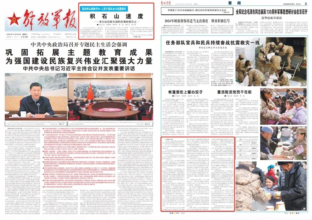 12月18日23时59分,一场突如其来的6.2级地震袭击了甘肃临夏州积石山县及其周边地区,造成重大人员伤亡,大量房屋毁坏,部分基础设施受损。统帅心系人民有号令,部队听令景从担重任。地震发生后,习主席高度重视并作出重要指示,要求全力开展搜救,及时救治受伤人员,最大限度减少人员伤亡,防范发生次生灾害,尽快组织调拨抢险救援物资,抢修受损的电力、通讯、交通、供暖等基础设施,妥善安置受灾群众,保障群众基本生活。解放军和武警部队坚决贯彻落实习主席重要指示,积极配合地方开展抢险救灾,尽最大努力保障人民群众生命财产安全。15分钟,这是西部战区前进指挥组,从抽组准备到整装出动所用时间;1.5小时,这是西部战区空军派出运-20飞越千里,指挥所转入现地指挥所用时间;1小时40分钟,这是第76集团军某旅300余名官兵抵达大河家镇展开救援行动所用时间;5小时,这是武警甘肃总队临夏支队官兵从接到命令到救出47名被压埋群众所用时间……一切为了人民。19日凌晨,西部战区党委第一时间传达学习习主席重要指示精神,根据军委联指中心命令,在震区开设前进指挥所,统一指挥部队救灾行动。灾情就是命令,灾区就是战场。地震发生后,西部战区陆军某旅抽组精干力量组成信息保障分队,火速奔赴积石山县大河家镇,打通部队抗震救灾指挥信息通道。分队采取主用和备用同步构建方式,快速开通多种通联手段,为抗震救灾指挥决策和任务部队救援行动提供信息支撑。成立前指、理顺关系、对接地方,统力量、统任务、统资源,高效的应急指挥体系迅速建立,一个指挥战区陆军、空军,甘肃省军区、青海省军区,武警甘肃总队、武警青海总队等力量的联合指挥机构高速运转。西部战区某局一名参谋说:“就像指挥打仗一样组织救援。”地震袭来,武警甘肃总队临夏支队官兵按照抢险救援预案迅速集结。机动途中遭遇道路中断,10余名先遣官兵在雪夜急行军3公里,争分夺秒赶赴一线。这支队伍里,一半以上是党员。该总队570余名官兵、60余台车辆抵达积石山县8个行政村后,担负搜救群众、转运伤员、疏通道路和搭建帐篷等任务。寒冷的夜晚,从废墟中被救出的老人孩子披着军大衣,很快住进了燃着取暖炉的临时帐篷。“地震黄金救援时间一般为72小时,但此次地震位于高原高寒地区,生命救援时间更加紧迫。我们必须快些、再快些!”接到战区出动指令后,第76集团军某旅官兵迅速集结完毕,300余名官兵冒着余震,通过落石地段、克服积雪打滑,挺进震中。甘肃省军区、青海省军区依令组织官兵、民兵向灾区集结,根据任务划分分组赶赴各点位投入抢险救灾。19日1时许,临夏军分区命令临夏县、临夏市、积石山县人武部集结民兵,准备物资器材,迅速做好抗震救灾准备。地震发生半小时后,各乡镇所属民兵就近展开救援,初步掌握辖区受灾情况,为专业救援力量提供救援引导。在通往灾区的各个交通要道,官兵、民兵昼夜坚守,确保过往物资人员顺利通行。一道道指令直达部队,一支支力量奔赴灾区。尽最大努力确保人民群众生命财产安全,官兵自觉强化号令意识,迎难而上、连续奋战。起飞,起飞!多型飞机依令担负灾情勘察任务,冒着恶劣天气穿梭震区,获取一手信息。技术装备与人力资源互为补充,为科学摆兵布阵提供有力支撑。突击,突击!充分发挥作战部队突击力强、武警部队机动力强、民兵熟悉当地地理人文环境优势,在联合救援体系内,任务部队密切配合、协同作战,快速高效开展人员搜救、群众安置和物资转运工作。增援,增援!任务地域海拔2000米左右,夜间气温接近零下20摄氏度,灾区群众保暖问题牵动着党中央和全国人民的心。西部战区果断增派西宁联勤保障中心130余人和57台装备,赴灾区提供热食、医疗等保障。“人民利益高于天,人民子弟兵为人民”,成为全体任务官兵的铮铮誓言。“石塬镇、刘集乡、大河家镇等地受灾严重,请求支援。”西部战区前进指挥所按程序调动周边单位紧急筹措棉帐篷1000余顶、取暖炉630余个,急行军分送到位。受灾地区海拔较高、天气寒冷,官兵竭尽全力为灾区群众提供保障,在临时帐篷外搭锅支灶,制作热食、熬制姜汤。19日中午,经过2个多小时的忙碌,热气腾腾的羊肉粉做好了,配上刚出锅的饼子,200余名群众吃上了灾后的第一顿热乎饭。任务地域地形复杂,一些房屋依山而建,道路结冰通行难度较大,不适合设置集中安置点。某旅官兵组成6个帐篷搭建小组,在大河家镇梅坡村和韩陕家村搭建450余顶帐篷安置受灾群众。得知临夏州中心血站受地震灾害影响,临床用血供应紧张,某旅408名官兵主动来到血站踊跃献血,累计献血9万余毫升,有效缓解了用血压力。“出动快、抵达快、展开快、保障快。速度,就是战斗力。”短短4天,解放军和武警部队官兵、民兵3200余人连续作战,搜救伤员70余人,搭建帐篷1900余顶,提供热食35310余份,巡诊12120余人次,运输搬运物资5200多吨,清理堆积物约368立方米,发放药品5489盒,保障棉被4030床,安装取暖炉1287个。“这样的部队能打仗,能打胜仗!”迷彩身影跃动冰天雪地,当地政府和灾区群众言由心生。