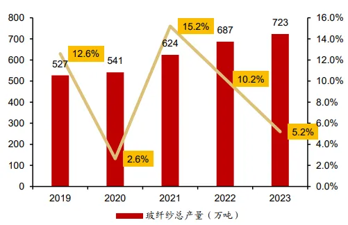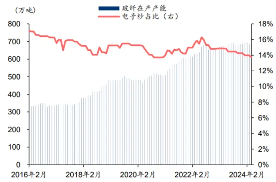 图:玻纤产能及电子纱占比(单位:万吨、%),华泰研究