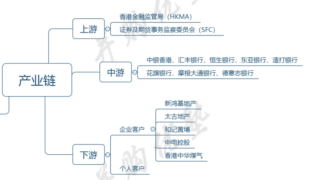 中游——商业银行,包括本地和国际银行,提供广泛的金融服务,如储蓄账户、贷款、信用卡、投资和财富管理等,代表有中银香港、汇丰银行、恒生银行、东亚银行、渣打银行等。国际银行如花旗银行、摩根大通银行、德意志银行等也在此设有分支机构。