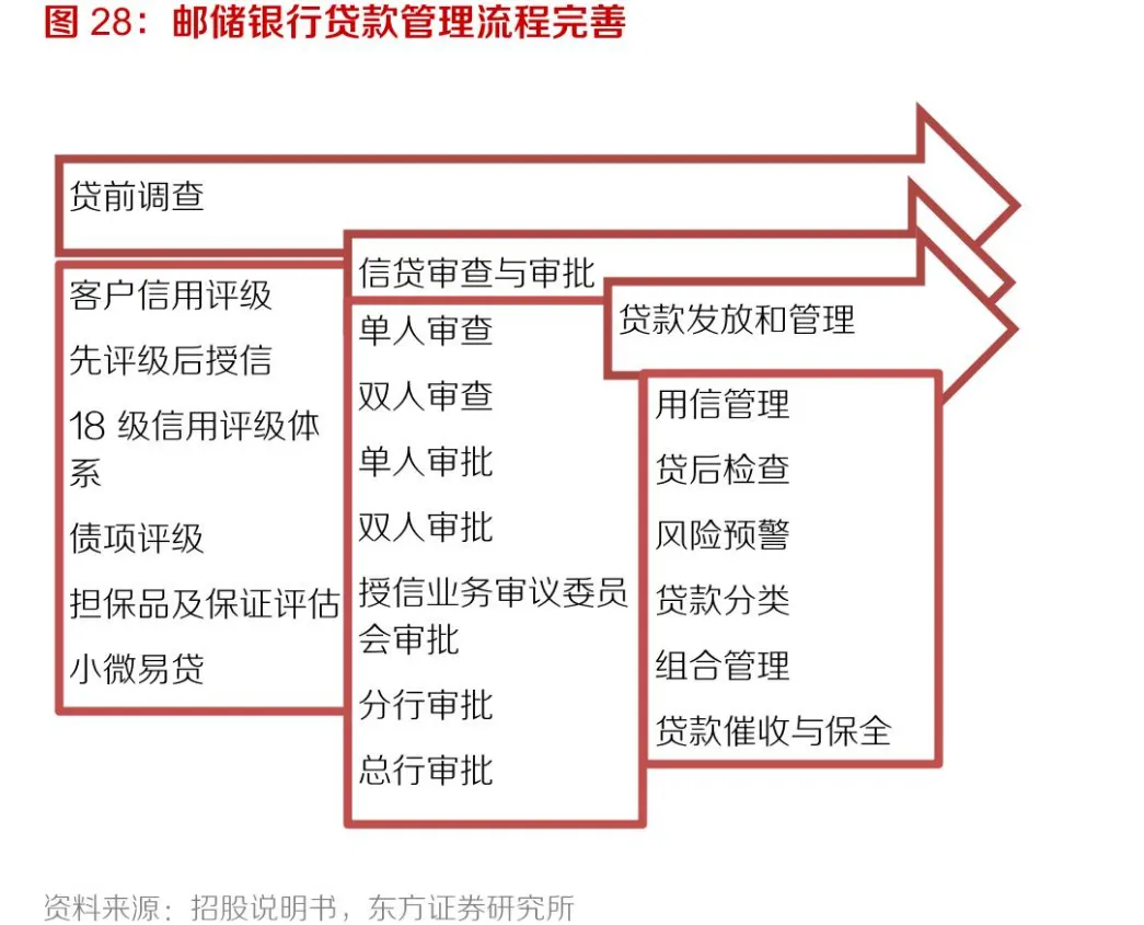 银行开展的业务复杂,以邮储银行贷款管理流程为例,涉及贷前调查、信贷审查与审批、贷款发放和管理等环节。