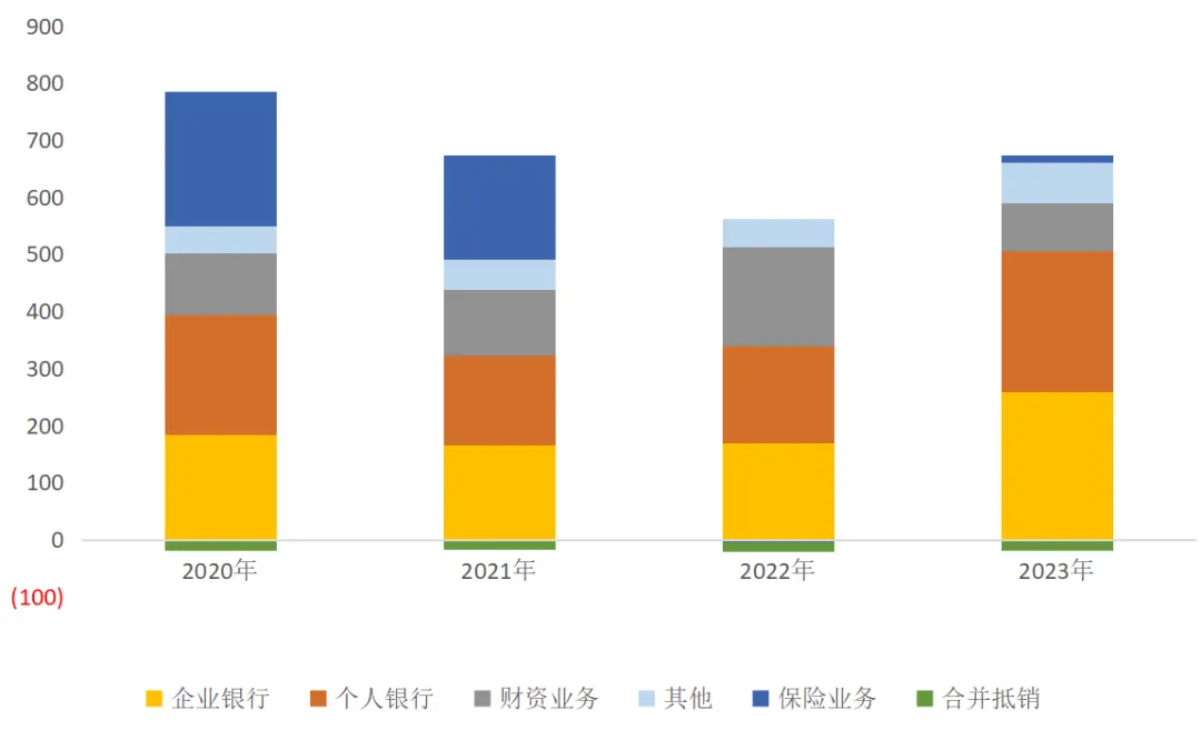 2023年,企业银行业务收入占比39.53%,个人银行业务占比37.72%,财资业务占比12.86%,其他业务占比10.7%,保险业务净经营收入较前几年明显下降,主要是金融资产投资亏损所致。