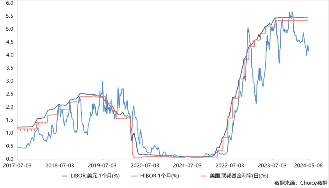 当HKMA调整DWC Base Rate时,这一变动通常会通过银行同业市场传递至HIBOR。在美联储加息周期,其通过购入港元来减少其流动性(体现为香港银行间总结余下降),从而推动HIBOR跟随LIBOR同向上行。从历史上看,加息过程中1个月HIBOR的变动往往滞后于1个月美元LIBOR,随后二者表现通常趋于同步。