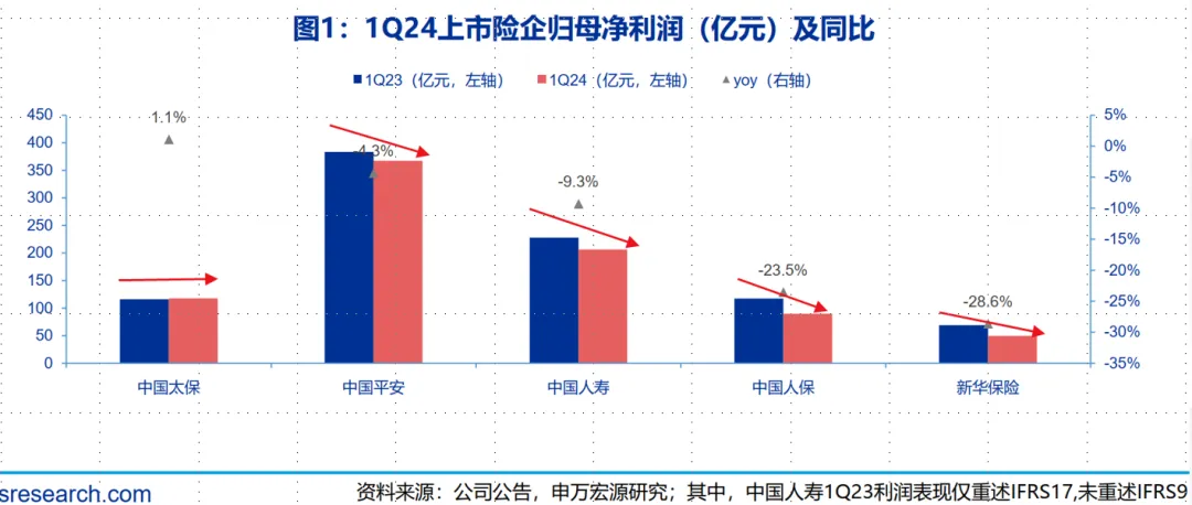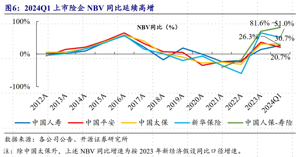 图:2024Q1上市险企NBV(新业务价值)同比延续高增,开源证券
