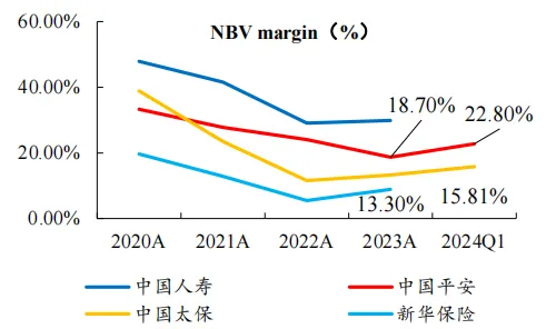 图:2024Q1上市险企NBV margin(新业务价值边际)明显改善