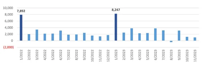 图:保险业每月原保费收入减赔付支出后余额(单位:亿元),农银国际证券