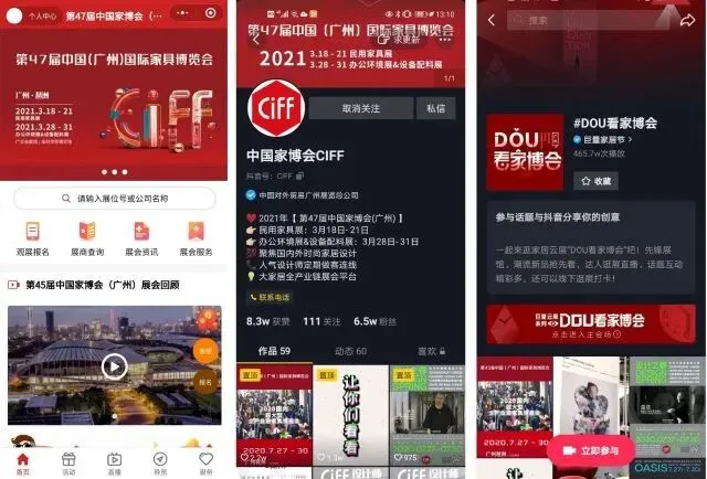 疫情发生以来,中国家博会也在积极利用自身官方网站、微信小程序、抖音端等平台,举办线上直播活动,致力于打通线上发布、展会商贸到线下开店全流程,形成商业闭环,助力外贸家居企业充分利用线上直播平台,抢先获取国内市场流量。