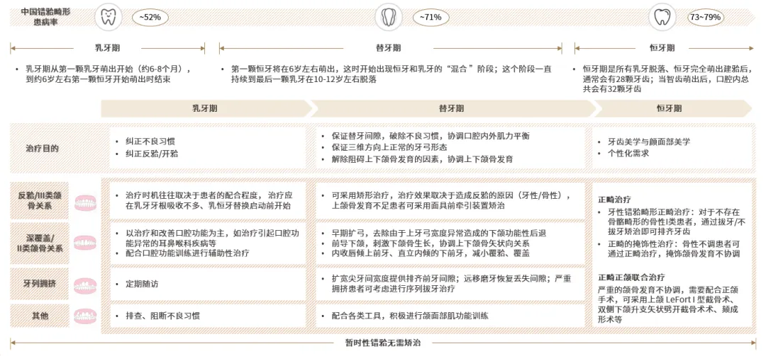 在牙齿不同的生长发育阶段,错?畸形的治疗目的和方式有所不同,在错?畸形发生发展的初期及时发现、合理有效干预,是降低错?畸形严重程度和复杂程度的重要手段。资料来源:中华口腔医学会;中国儿童错?畸形早期矫治专家共识;儿童和青少年早期错?畸形诊治策略的专家共识;《口腔正畸学》;灼识咨询