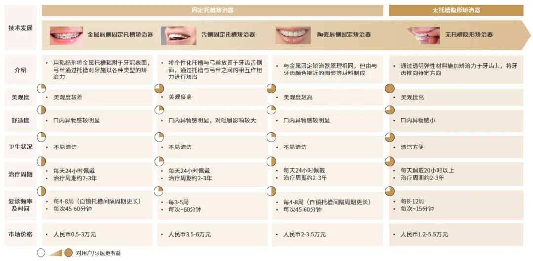 错?畸形的治疗主要应用正畸矫治器,分为固定矫治器和活动矫治器,可进行预防性矫治、阻断性矫治和一般性矫治;无托槽隐形矫治器是活动矫治器的一种,在保证治疗效果的基础上,无托槽隐形矫治器为患者提供了兼顾美观、便捷、舒适、卫生的更优选择。资料来源:口腔正畸无托槽隐形正畸技术指南(2021版);中华口腔医学杂志;灼识咨询