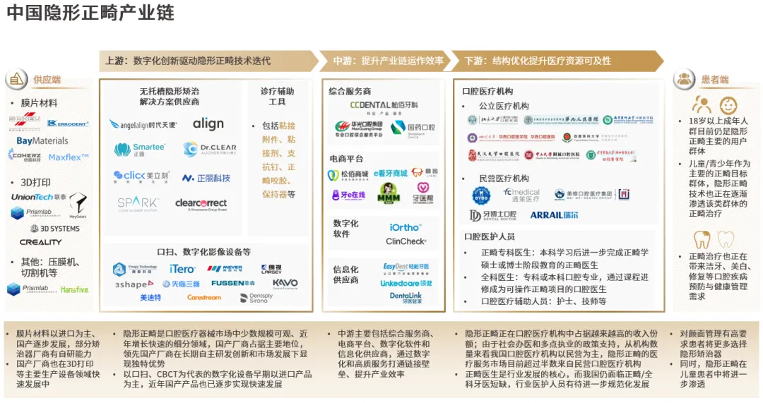 中国隐形正畸产业链主要由上游的隐形正畸诊疗相关的口腔医疗器械、中游的综合服务商和数字化软件等、下游的口腔医疗机构和医护人员构成。