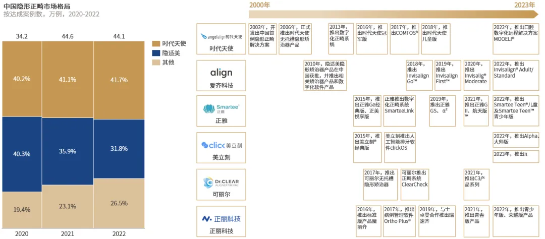 开启于2000年初,中国隐形正畸行业在过去20年中快速发展。在政策及行业规范方面,从早期国家政策引导“多点执业”、“社会办医”等方面大力推动了口腔医疗行业发展,到随着隐形正畸行业发展、针对无托槽隐形矫治行业标准的不断建设和完善,隐形正畸行业向着标准化、规范化的方向发展。在无托槽隐形矫治技术方面,随着时代天使在2006年获得中国首个隐形矫治技术发明专利、并获得中国首张无托槽隐形矫治器注册证,各领先厂商加速技术革新与产品迭代,为临床诊疗提供更丰富多样的解决方案。在产业发展方面,数智化赋能隐形正畸产业不断发展完善,资本助力产能拓展,中国厂商在产品技术的不断成熟和规模发展下,开始逐渐走向海外市场,中国隐形正畸行业也正在步入新的发展阶段。资料来源:国务院;国家卫健委;NMPA;各公司官网;上市公司公告;灼识咨询
