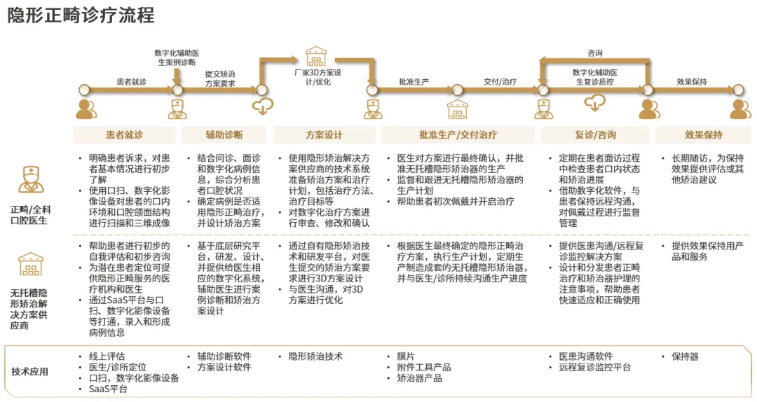 完整的隐形正畸诊疗流程包括患者就诊、辅助诊断、方案设计、批准生产/交付治疗、复诊/咨询、效果保持六个阶段,正畸/全科口腔医生借助无托槽隐形矫治解决方案供应商提供的产品和技术服务,围绕各环节提供的各类技术应用,为患者提供隐形正畸诊疗服务。