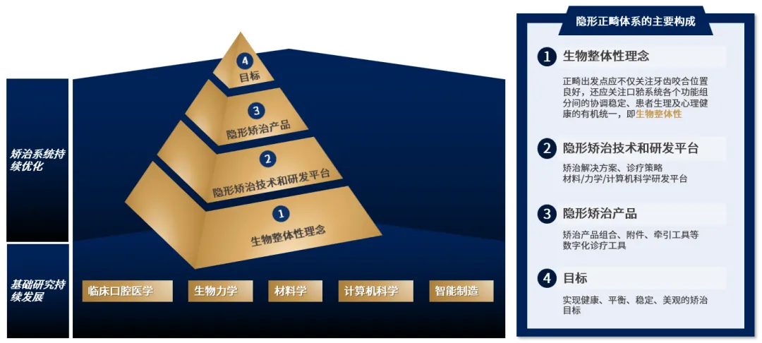 技术篇:传承现代正畸理论、五大学科交叉融合,引领中国隐形正畸技术革新20世纪初至今,在历代理论研究和实践下,正畸技术逐步发展。现代正畸理论建立在固定矫治基础上,目前固定矫治已形成较完整的理论体系,并逐渐向更强的牙齿控制能力、更少的椅旁时间、更大的应用灵活性方向发展;继承传统牙?畸形矫治理念,无托槽隐形矫治技术是一种新的正畸技术,其具有更高个性化程度、更短椅旁时间、更美观舒适等特征,在现代正畸理论及思想基础上继承、发展、创新。建立于五大学科基础之上,隐形矫治技术体系从遵循生物整体性的理念出发,形成支持研发和方案设计的隐形矫治技术和研发平台,并通过一系列隐形矫治产品,最终帮助患者达到健康、平衡、稳定、美观的矫治目标;而作为隐形正畸技术体系的基础,五大学科基础研究的深入和应用转化,是隐形正畸行业发展的持续动力。