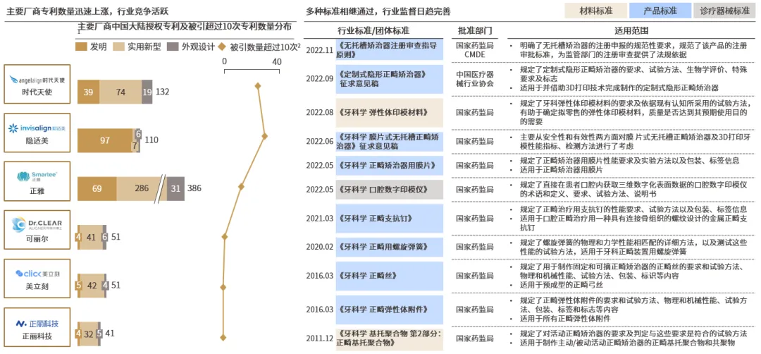 当前,无托槽隐形矫治技术领域仍在持续的探索和创新。随着对以正畸学为代表临床口腔医学的理解深入、技术革新下的诊疗规范形成,临床医生对多样、复杂案例处理能力增强,加之诊疗工具的创新开发和应用,隐形正畸边界不断拓宽、临床医生更加得心应手。与此同时,全球正畸行业也正在材料学、生物力学、智能制造和计算机科学持续深入研究,探索无托槽隐形矫治技术下一代范式革新。在材料学与生物力学方向,材料创新有望从根本上改变隐形正畸治疗;现有材料下的改进与“从0到1”创新是未来应关注的方向;在智能制造方向,直接3D打印可能成为隐形正畸下一个范式创新,但其相关研究仍在进展中,尚未达到稳定应用程度;在计算机科学方向,计算机科学将持续深度赋能隐形矫治技术体系各环节,助力行业发展。此外,活跃的行业竞争之下,行业也正在愈加注重知识产权保护和技术规范,标准水平不断完善提升,行业整体朝向积极快速的方向发展。注:1 根据智慧芽数据库统计截至2022年12月31日信息;2 只针对各公司的中国专利的被引专利数量进行分析统计;专利被引用是指1件专利被在后专利的审查员或申请人引用,其表征着一种技术上的关联性;如果1件专利的被引次数越多,人们通常会认为这件专利技术重要程度越高、专利价值越高