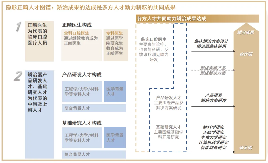 人才篇:五大学科共筑人才图谱,口腔医生仍面临较大缺口作为一项高度复合型的学科,隐形正畸事业的发展需要来自五大学科多方人才的共同努力。正畸医生为代表的临床口腔医疗人才是我国正畸事业的中流砥柱;虽然中国正畸学术水平与国际前列差距不断缩小,但由于我国学科建设起步较晚,口腔医疗人才仍面临大量缺乏,尤其是正畸专科人才。受益于我国科技水平的快速发展和赶超,目前在生物力学、材料学、计算机学科和智能制造领域我国均已具备高端人才,但具备创新研发能力的复合人才培养仍需假以时日。资料来源:中国卫生健康统计年鉴;灼识咨询