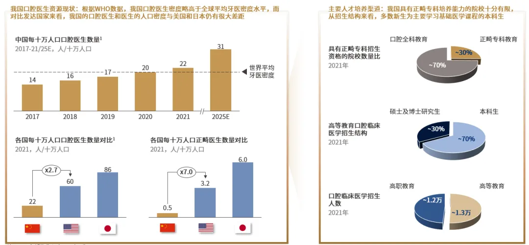 中国正畸水平虽已实现快速发展,但整体供给资源及教培体系等仍存较大待提升空间。根据WHO数据,当前我国口腔医生密度仅略高于全球平均牙医密度水平,而对比发达国家来看,我国的口腔医生和医生的人口密度与美国和日本仍有很大差距,中国口腔医师有限的培养渠道难以支撑较大的需求缺口。