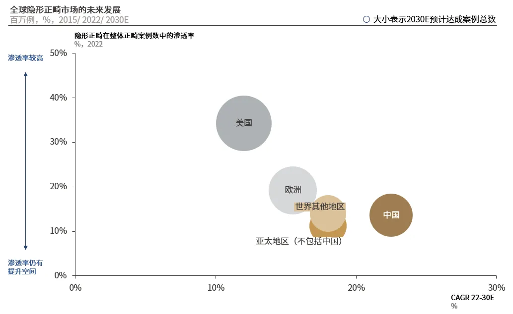 作为全球第二大市场,隐形正畸渗透率较低、发展快速的中国市场未来空间可观。从地理区域来看,中国是隐形正畸渗透率较低、案例数增速较高的国家/地区之一,2015年至2022年,中国隐形正畸案例数年复合增长率超35%,而隐形正畸的渗透率仍不到15%。预期未来,中国隐形正畸案例数的年复合增长率将保持在20%以上,继续保持高于全球水平的增长。