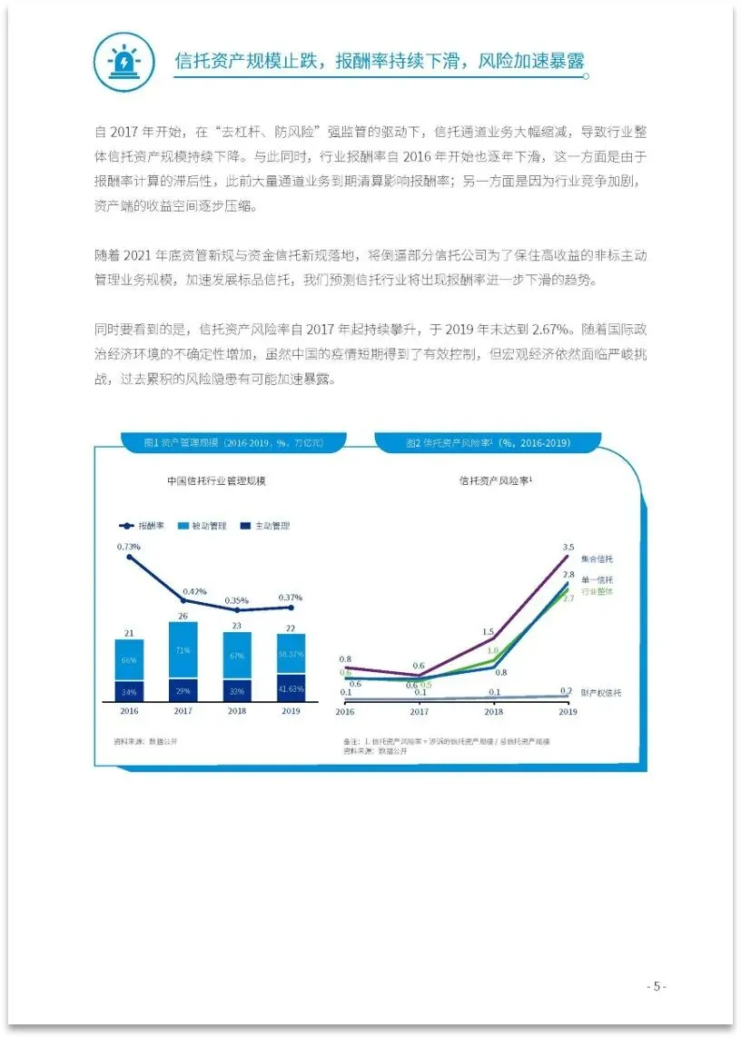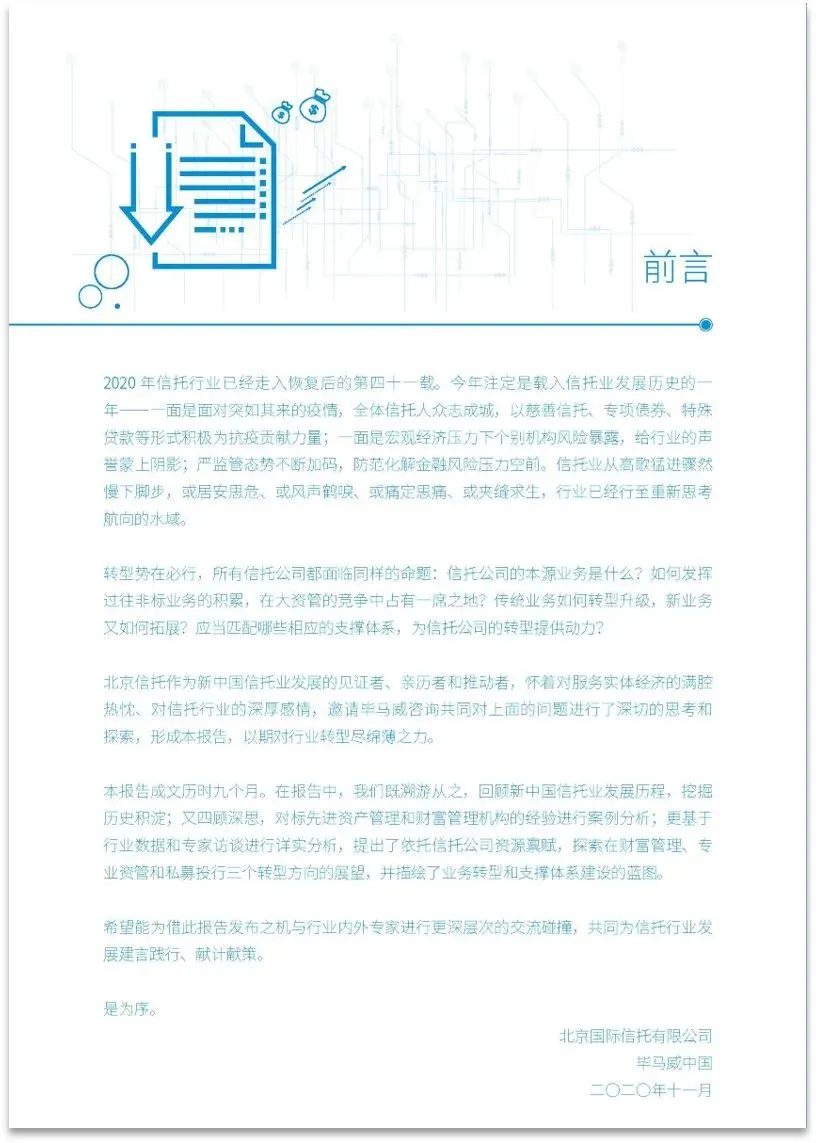 2020年11月,北京国际信托有限公司联合毕马威中国发布《道阻且长,行则将至——中国信托行业发展趋势和战略转型研究报告》,这份历时九个月的报告旨在探索信托公司如何发展本源业务、如何提升在大资管行业的竞争力、如何推动传统业务转型及扶持新业务拓展等行业共同面临的命题,以期把握行业未来的发展方向。北京信托作为新中国信托业发展的见证者、亲历者和推动者,怀着对服务实体经济的满腔热忱、对信托行业的殷切企盼,邀请毕马威共同对中国信托行业发展等问题进行了深切的思考和探索,形成本报告,以期对行业转型尽绵薄之力。
