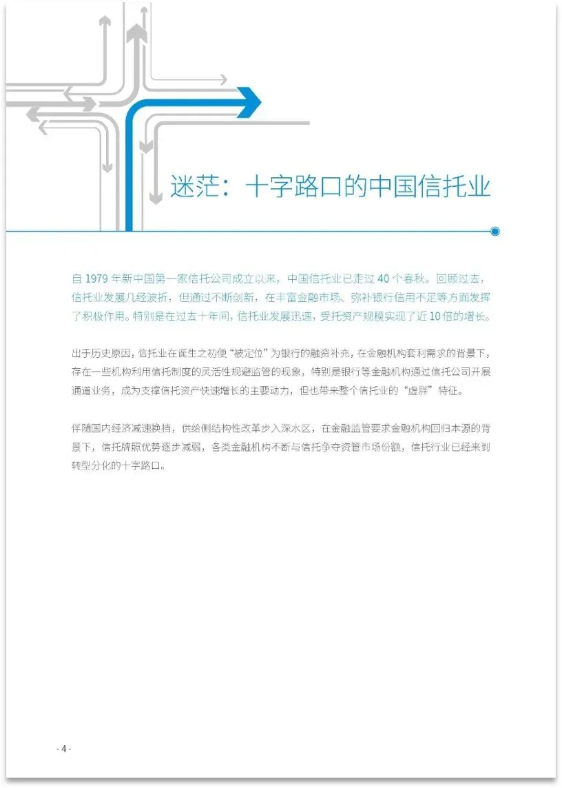 中国信托业已走过 40 个春秋,回顾过去,信托业发展几经波折,但通过不断创新,在丰富金融市场、弥补银行信用不足等方面发挥了积极作用。特别是在过去十年间,信托业发展迅速,受托资产规模实现了近 10 倍的增长。伴随国内经济减速换挡,供给侧结构性改革步入深水区,在金融监管要求金融机构回归本源的背景下,信托牌照优势逐步减弱,各类金融机构不断与信托争夺资管市场份额,信托行业已经来到转型分化的十字路口。