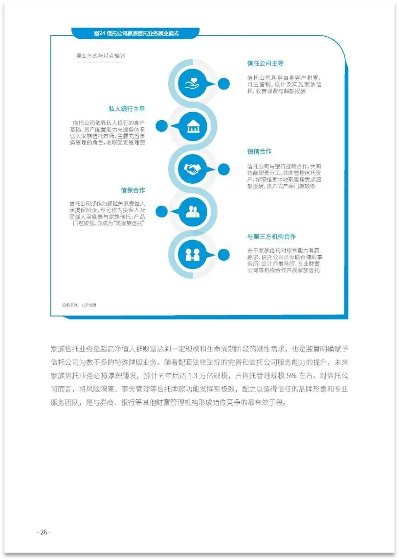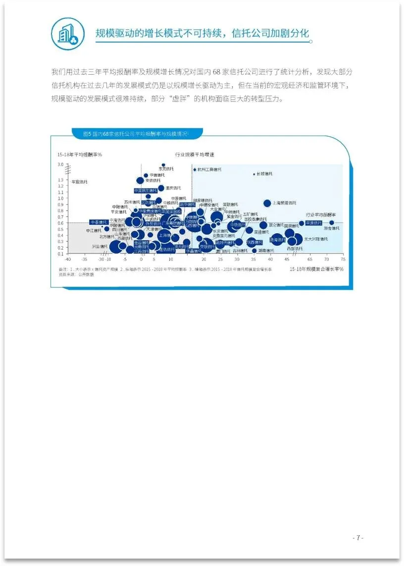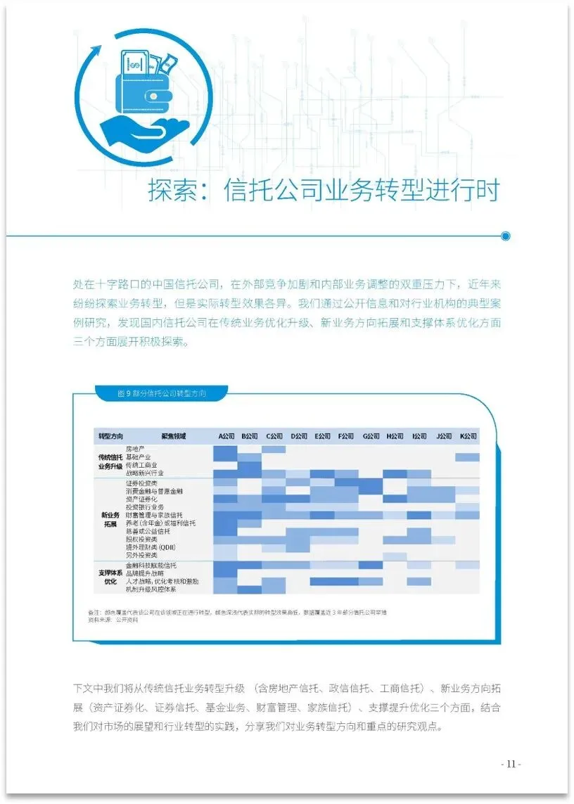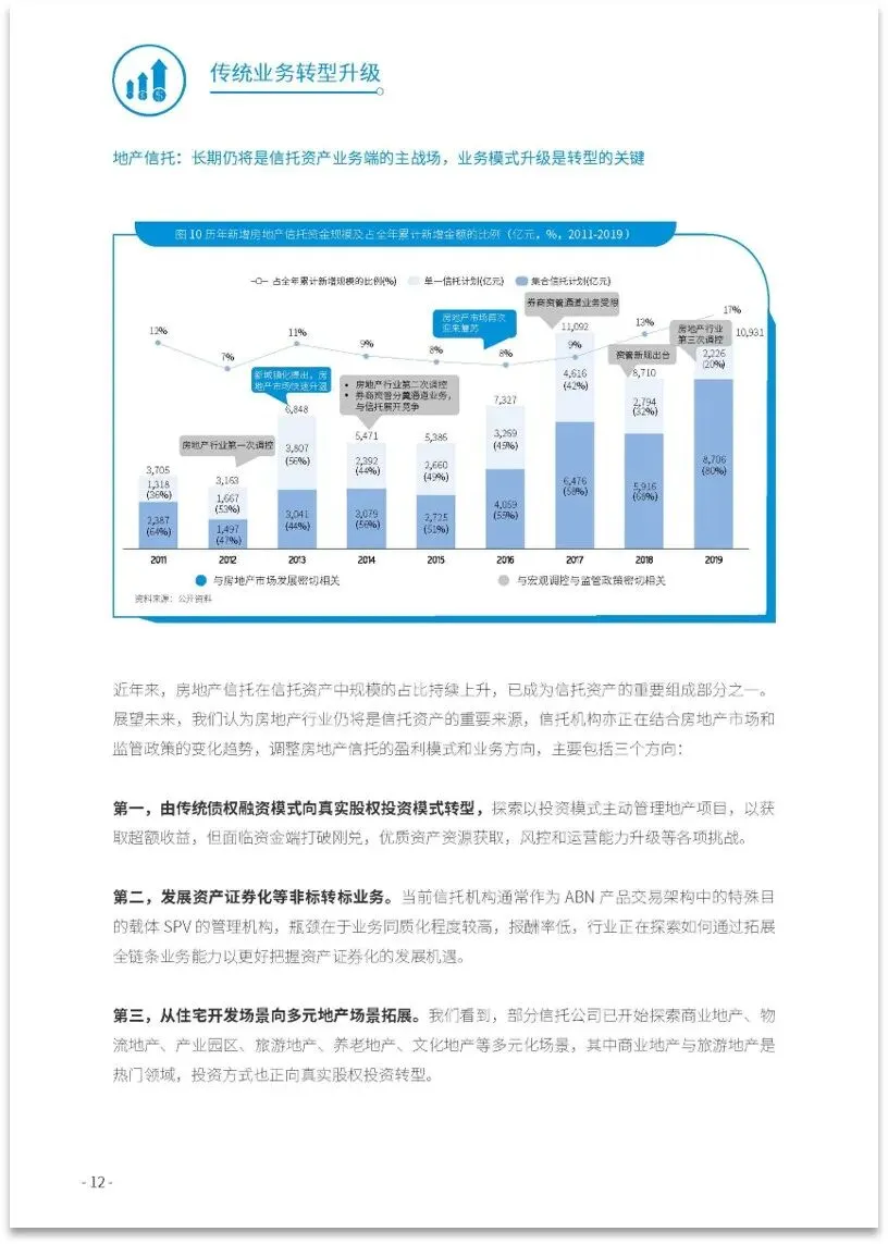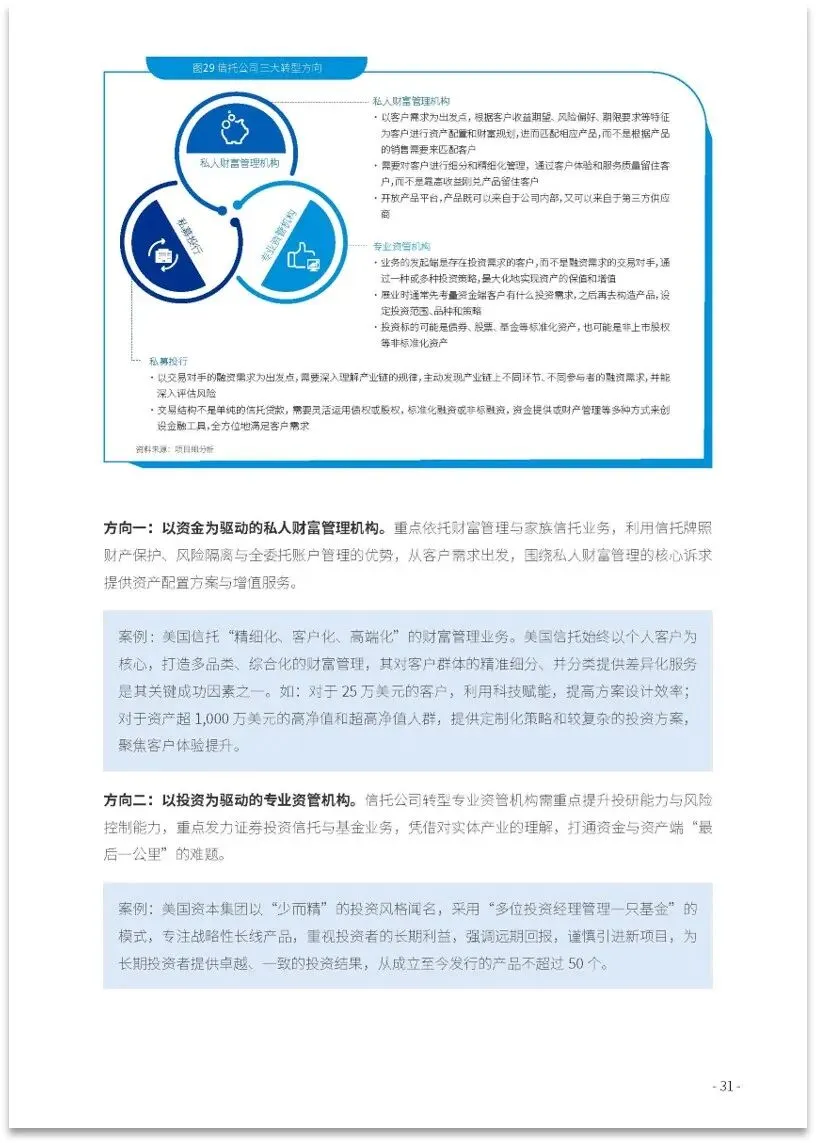 本报告在回顾我国信托业发展历程与分析国外信托类机构演进基础上,基于详实的数据分析和深入的市场调研,探讨了信托业面对机遇与挑战转型发展的路径——即依托自身资源禀赋,以私人财富管理机构、私募投行与专业资管机构三大方向为发力点,不断进行传统业务升级、新业务拓展和支撑体系优化建设。