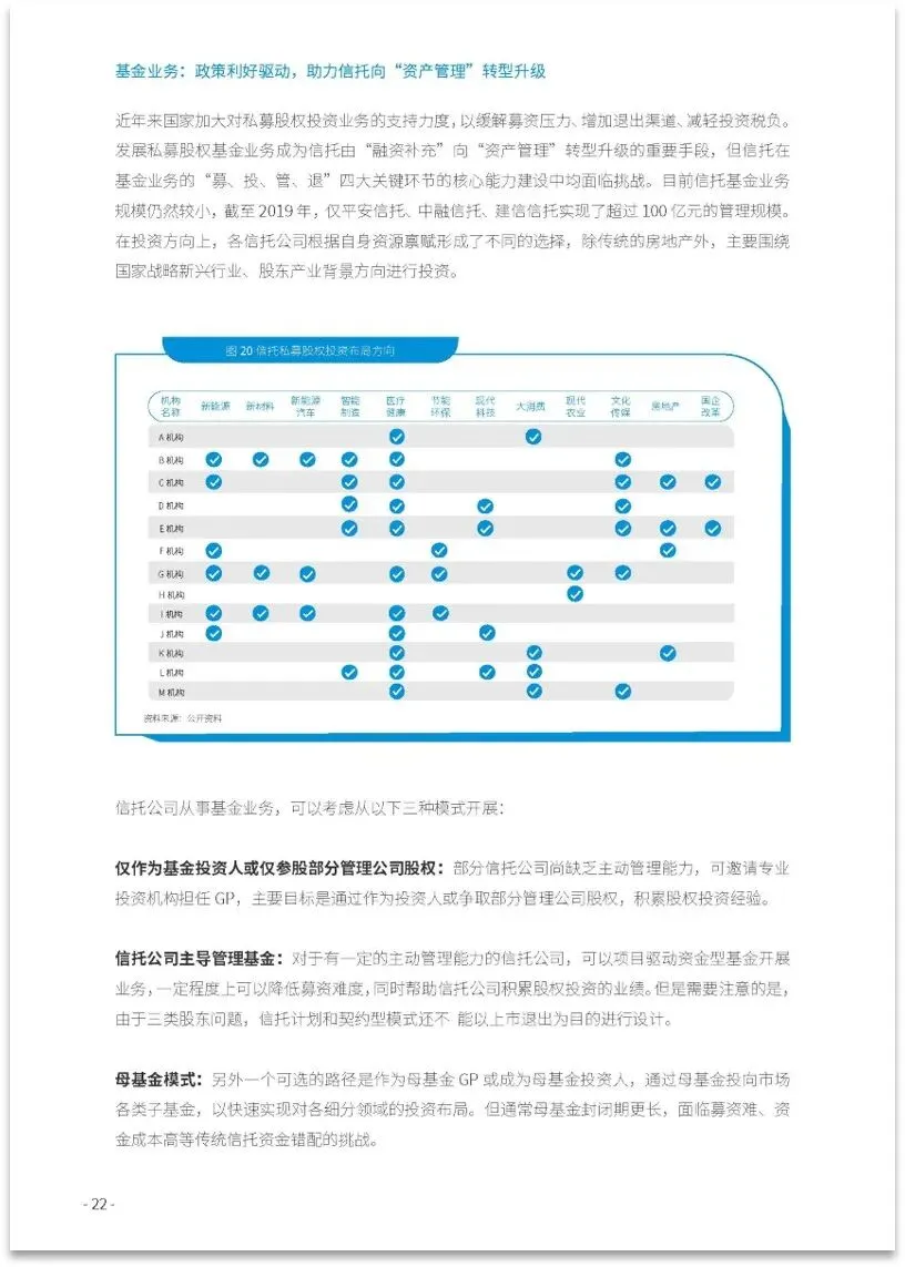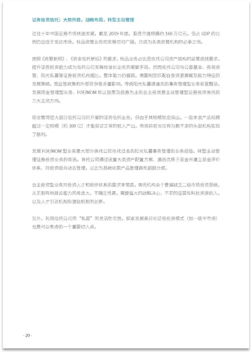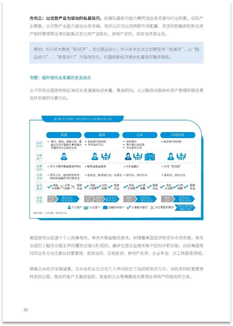 展望未来,我国处于经济转型深化、产业升级不断推进的重要战略机遇期,我国信托业必将继续发挥信托制度优势、灵活服务实体经济,于未来一段时间内在构建双循环新发展格局中有所作为。对照发达国家地区信托业的发展路径,可以预期随着我国金融监管体系的逐步完善,各类金融机构专业能力进一步提升,信托公司的融资服务功能将进一步弱化。未来信托公司的发展将结合信托制度的本源特性,以承担其他金融机构部不具备或不完全具备的“真信托”功能,回归“受人之托、代人理财”定位。我们相信,功能全面、服务专业、品种丰富、投向多元的现代信托体系也是中国信托行业的演进方向。