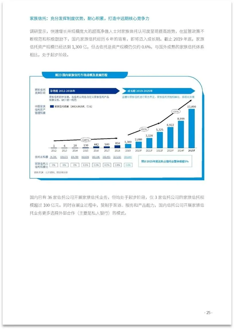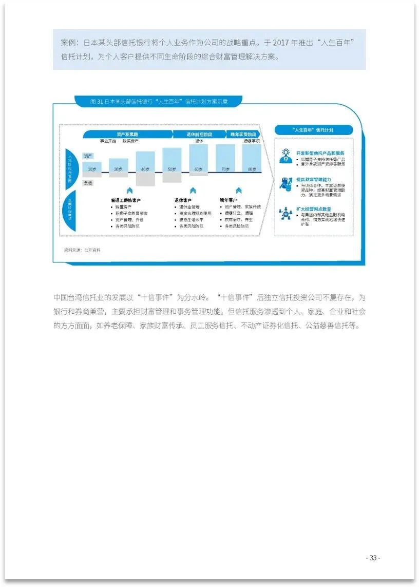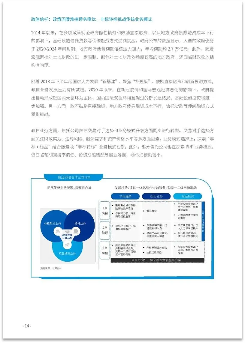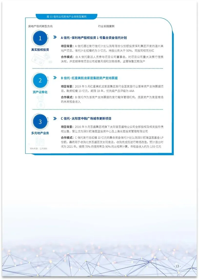 展望未来,我国处于经济转型深化、产业升级不断推进的重要战略机遇期,我国信托业必将继续发挥信托制度优势、灵活服务实体经济,于未来一段时间内在构建双循环新发展格局中有所作为。对照发达国家地区信托业的发展路径,可以预期随着我国金融监管体系的逐步完善,各类金融机构专业能力进一步提升,信托公司的融资服务功能将进一步弱化。未来信托公司的发展将结合信托制度的本源特性,以承担其他金融机构部不具备或不完全具备的“真信托”功能,回归“受人之托、代人理财”定位。我们相信,功能全面、服务专业、品种丰富、投向多元的现代信托体系也是中国信托行业的演进方向。