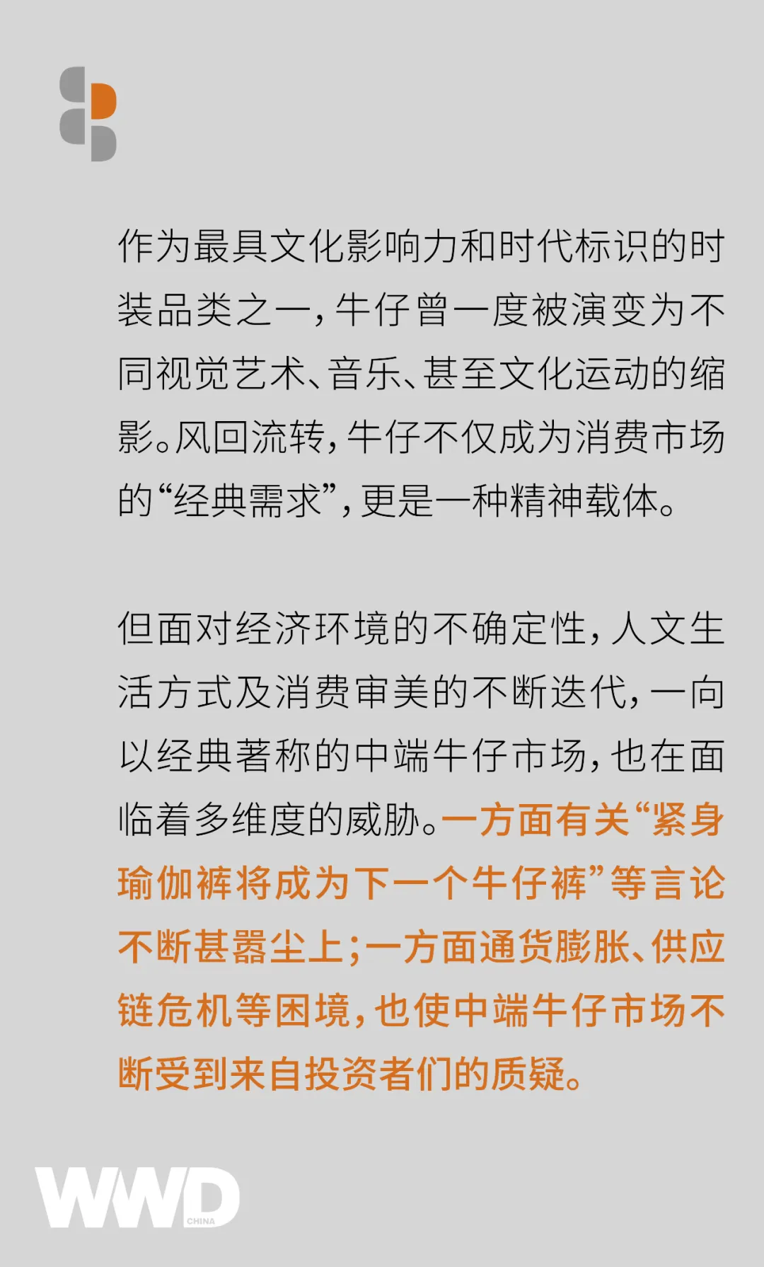 业内人士预计随着疫后经济的恢复购买力的增加、可支配收入水平、牛仔裤对身材的包容度以及牛仔市场可持续发展的进一步推进,都能极大程度地推动牛仔裤市场的扩张。WWD