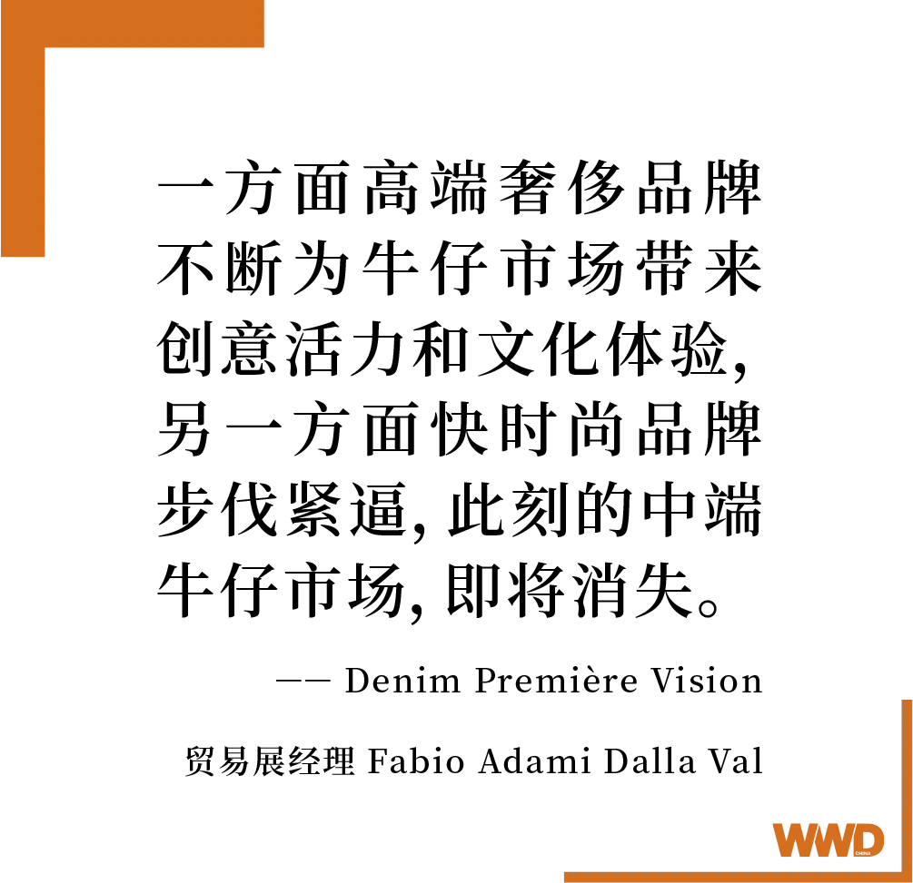 值得注意的是,在前不久的 Denim Première Vision 贸易展上,诸多业内人士发言称,目前牛仔市场正在呈现出的是两极分化的局面。Denim Première Vision 贸易展经理 Fabio Adami Dalla Val 向 WWD 说道:“我看到两个不同的集群主导市场,一方面高端奢侈品牌正不断为牛仔市场带来高端品质保障、创意活力、和文化体验,另一方面快时尚品牌步伐紧逼,而此刻的中端牛仔市场,即将消失。在快时尚品牌和奢侈品牌的冲击下,他们很难跟上行业上新及创新的生产周期和效率。”
