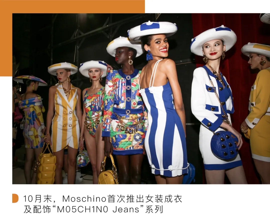 奢侈品牌有关牛仔文化叙事的传承与创新,也不失为中端牛仔市场所面临的强劲竞争。今年 10 月末,Moschino 首次推出女装成衣及配饰“M05CH1N0 Jeans”系列,灵感来自牛仔文化、历史与传统。该系列是对 1986 年 Moschino 品牌创始人 Franco Moschino 推出的 Moschino Jeans 系列的重新诠释。通过全新的设计和生产方式定义牛仔的特点,捕捉牛仔文化和历史的经典精神。该系列致敬标志性的品牌价值:充满戏谑的反讽和作为艺术评论的文化象征。