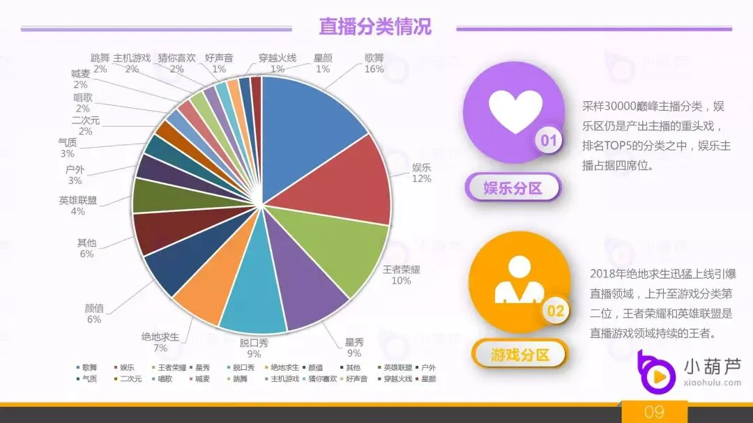 5、2018年直播行业直播分类数据:全年主播体量较大,这里我们采样了小葫芦主播全年指数综合评估前三万名巅峰主播的分类数据。从这些主播分类中可以看出在2018年直播行业中歌舞和娱乐仍然占据大头,在TOP5分类中娱乐项相关占据四席的情况下,王者荣耀仍然一枝独秀,可见这款现象级的手游在2018年仍然是最受欢迎的直播游戏。接下来的绝地求生和英雄联盟无疑都在分类前列,2018年大红大紫的绝地求生上线迅速引爆直播热潮,从而诞生了诸多知名的游戏主播。虽然分类排名中略高于英雄联盟,但热度在后半年却被英雄联盟有所赶超,这个在下面的内容中会有详细分析。