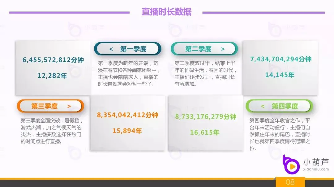 4、2018年直播行业直播时长数据:2018年全平台主播的直播时长是5.8万年,这是一个昂长的时间单位,从此就可以看出主播们有多努力了。我们将数据分为四个季度来解释,从数据中可以看出,每一个季度的时间都超过了一万年,也就是说每一个季度都能让大话西游中周星驰爱的誓言重来一次了。
