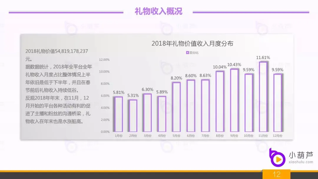 1、2018年直播行业主播礼物收入概况:据数据统计,2018年全年礼物收入548亿元,如此丰厚的收入,也难怪如此多的主播前仆后继的进入直播行业。礼物收入和弹幕条数的月度走势有多相似,呈现出月度递增的趋势。全年中年末月份的收入比年初的收入甚至高达接近两倍了。这无疑得益于平台的各项争霸活动,让直播行业的土豪和粉丝们在年末纷纷而动,为了自己喜爱的主播冲榜,获得名次。直播平台的主播排名活动是整体礼物收入的一项重要的推送剂。