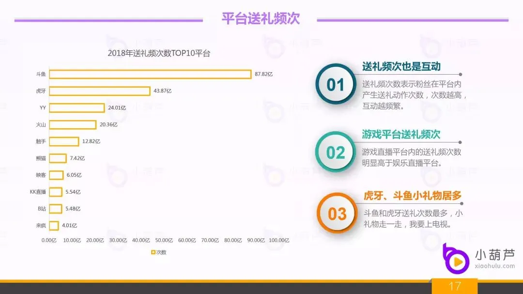 6、2018年直播行业各个平台的送礼次数:送礼次数也就是用户在直播间产生的送礼动作,各个平台之间的差异是巨大的,斗鱼在送礼次数中遥遥领先,送礼次数为87亿,虎牙位居第二位,两个平台得益于小礼物居多,平台内小活动和主播自发小活动也是层出不穷。游戏平台和娱乐平台对比,游戏平台更需要人数和人气的捧场,对于观众的互动性掌控的相对于娱乐主播更好,游戏直播有更多的内容和粉丝们进行交代,有更多的内容促进粉丝进行互动,从而产生更多的送礼动作。
