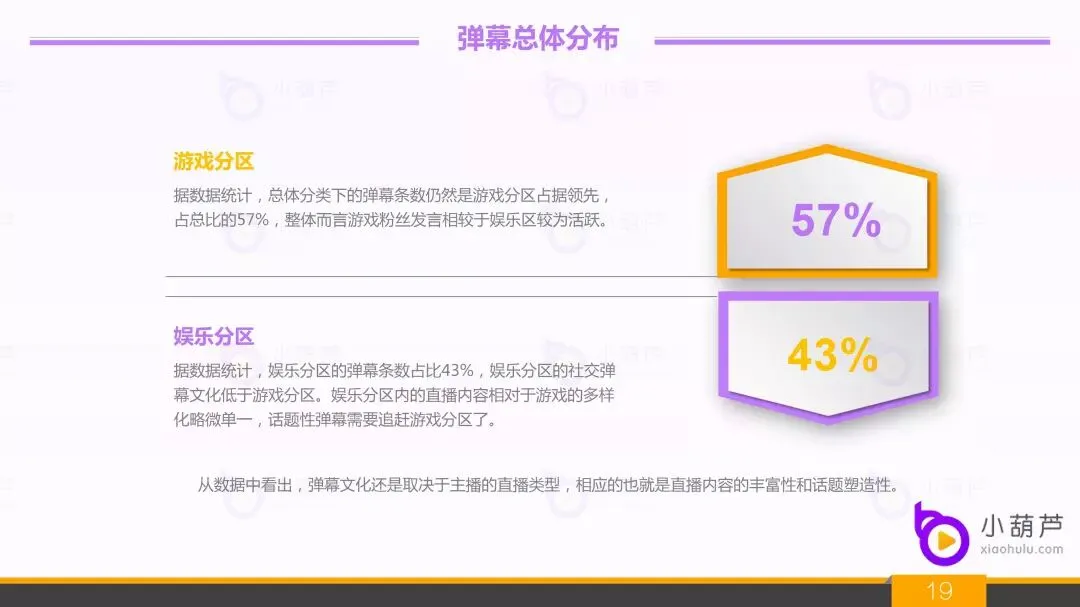 1、2018年直播行业弹幕总体分布:游戏和娱乐两个直播领域中,游戏领域的直播弹幕条数强于娱乐领域,游戏领域在整体弹幕体量中占比高达57%,整体来看活跃度强于娱乐领域。弹幕文化是一种主播和粉丝的互动文化,也可以是粉丝自发的一种文化,来源无疑就是直播内容,相对于内容丰富性来看,游戏领域的内容更为丰富,话题性和可探讨的也就越多,弹幕量级强于娱乐领域也就显而易见了。另一方面,游戏领域主播为了增加与粉丝活跃会有弹幕活动不断产生,加之用户和粉丝基数较大,弹幕量级也就顺理成章上去了。