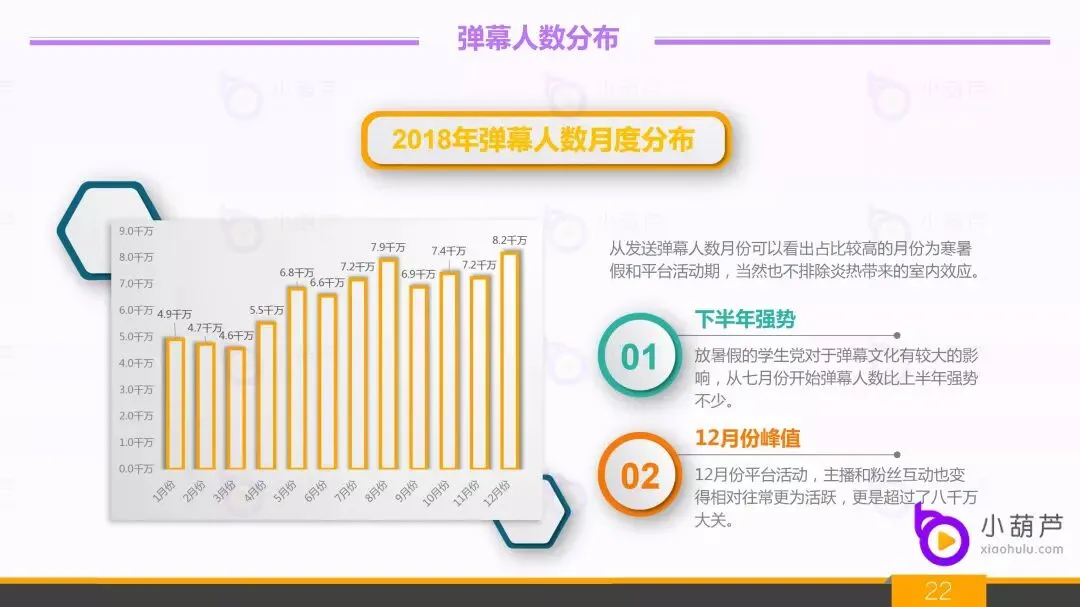 4、2018年直播行业弹幕人数分布:弹幕人数分布显示出了粉丝们对于直播行业的热情和喜爱,数据表明,在7月份的七千两百万之后就维持平稳,到了12月份达到了峰值8千两百万。从发送弹幕人数月份可以看出占比较高的月份为寒暑假和平台活动期,前面已经提及炎热和寒冷带来的室内效应及12月份平台内的年终活动的促进。