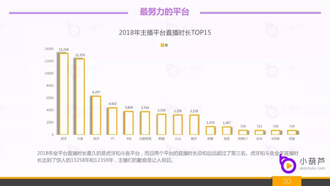 5、2018年直播行业最努力的平台:通过综合直播平台内主播们的直播时长总和进行排序。2018年全平台直播时长最久的是虎牙和斗鱼平台,而且两个平台的直播时长总和远远超过了第三名。虎牙和斗鱼全年直播时长达到了惊人的13258年和12359年,主播们的勤奋是让人侧目。