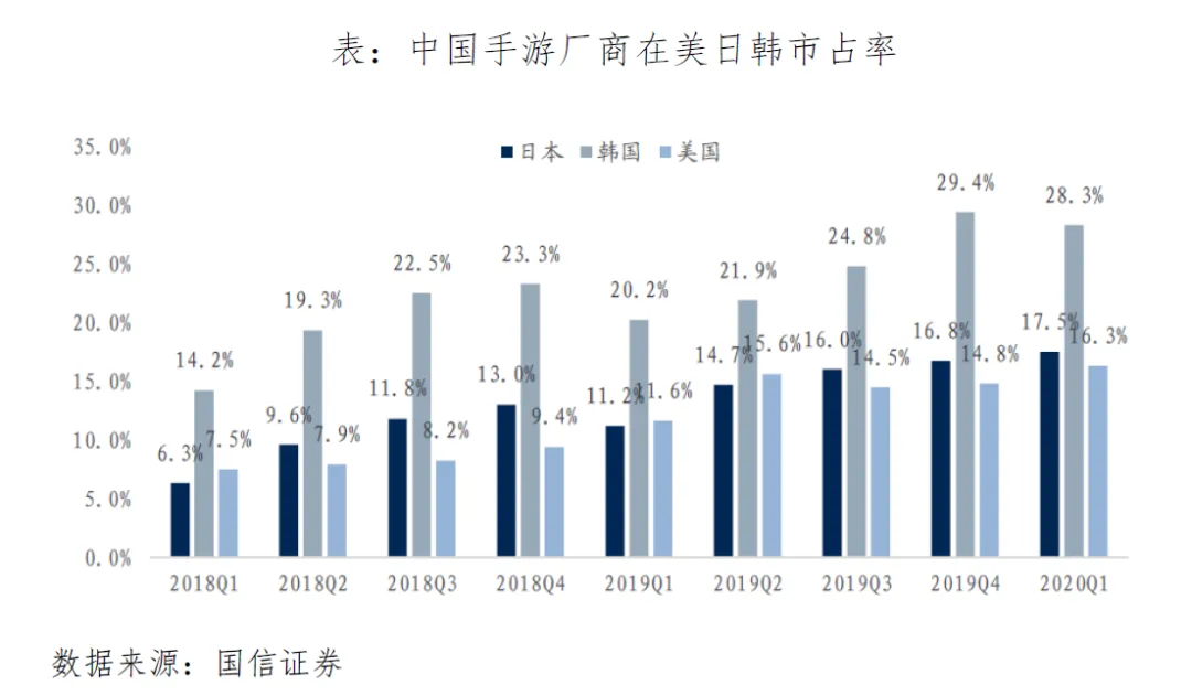 另一方面,我国“游戏出海”加速,2019年国产游戏海外市场销售规模达到112亿美元,市占率从2017年的10%升至2019年的16%;其中在美日韩地区出现明显提升。中国是全球最大的手游市场,并且迅速跻身全球手游制作能力最强的国家行列,海外市场的突破将为境内游戏研发厂商提供新的增长空间。