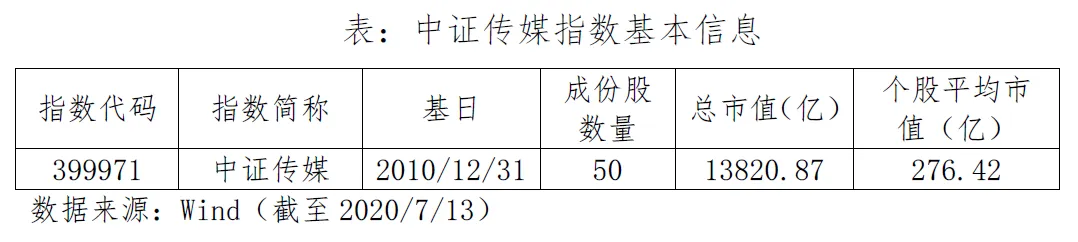 中证传媒指数是用于反映传媒领域具有代表性上市公司股票整体表现的股票指数。该指数以2010年12月31日为基日,截至2020年7月13日,指数总市值达到13820.87亿元,平均个股市值276.42亿元。