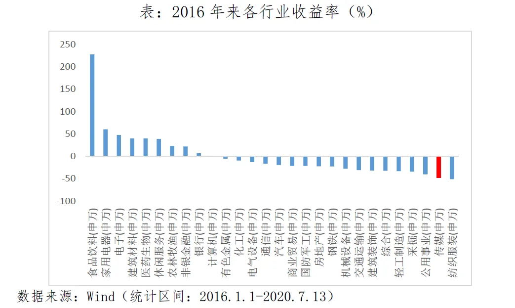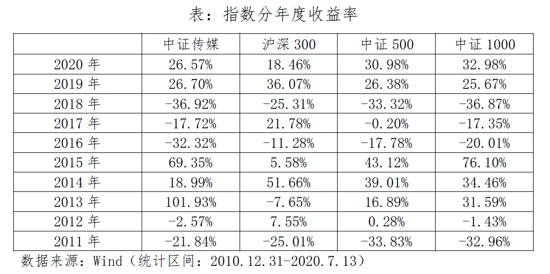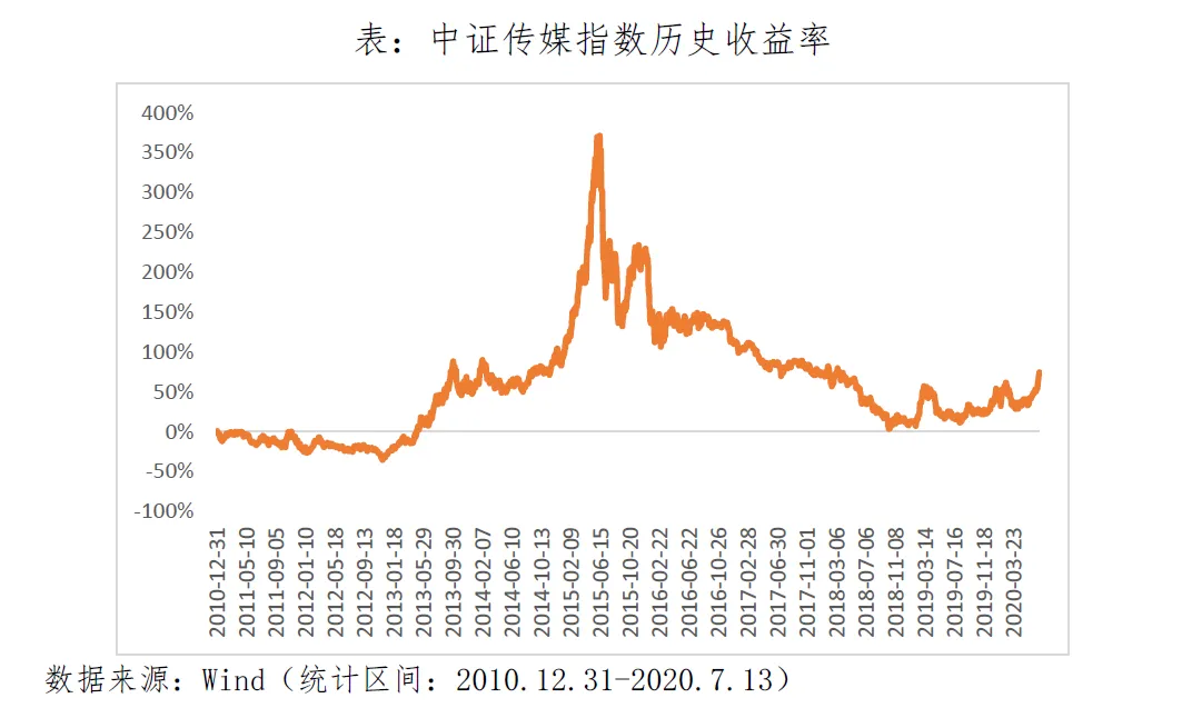 自基日以来截至2020年7月13日,中证传媒指数累计收益率为74.56%,年化收益率6.20%。2016年至今,传媒板块累计下跌48.26%,在所有申万一级行业中排名倒数第二,但这也意味着当前传媒相关指数已经经历了深度回调,下跌空间有限。