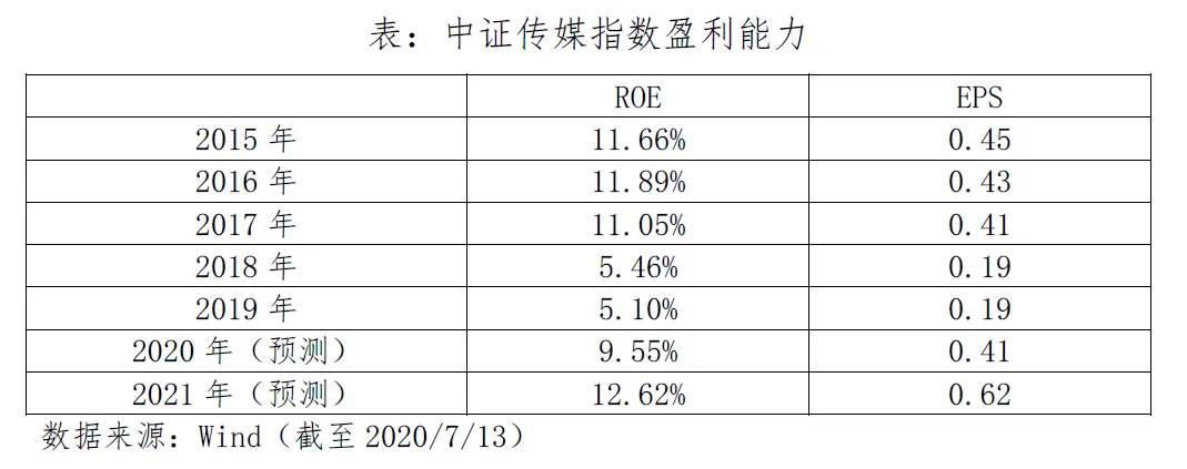从成长能力来看,在2016-2018年,由于监管趋严等因素,中证传媒指数主营收入持续下滑;但2019年来随着5G开始逐步推广,以游戏公司为代表的传媒企业业绩开始爆发,中证传媒指数2019年主营收入同比增速高达55%。而随着5G的加速推进,传媒板块公司业绩预计将继续回升。